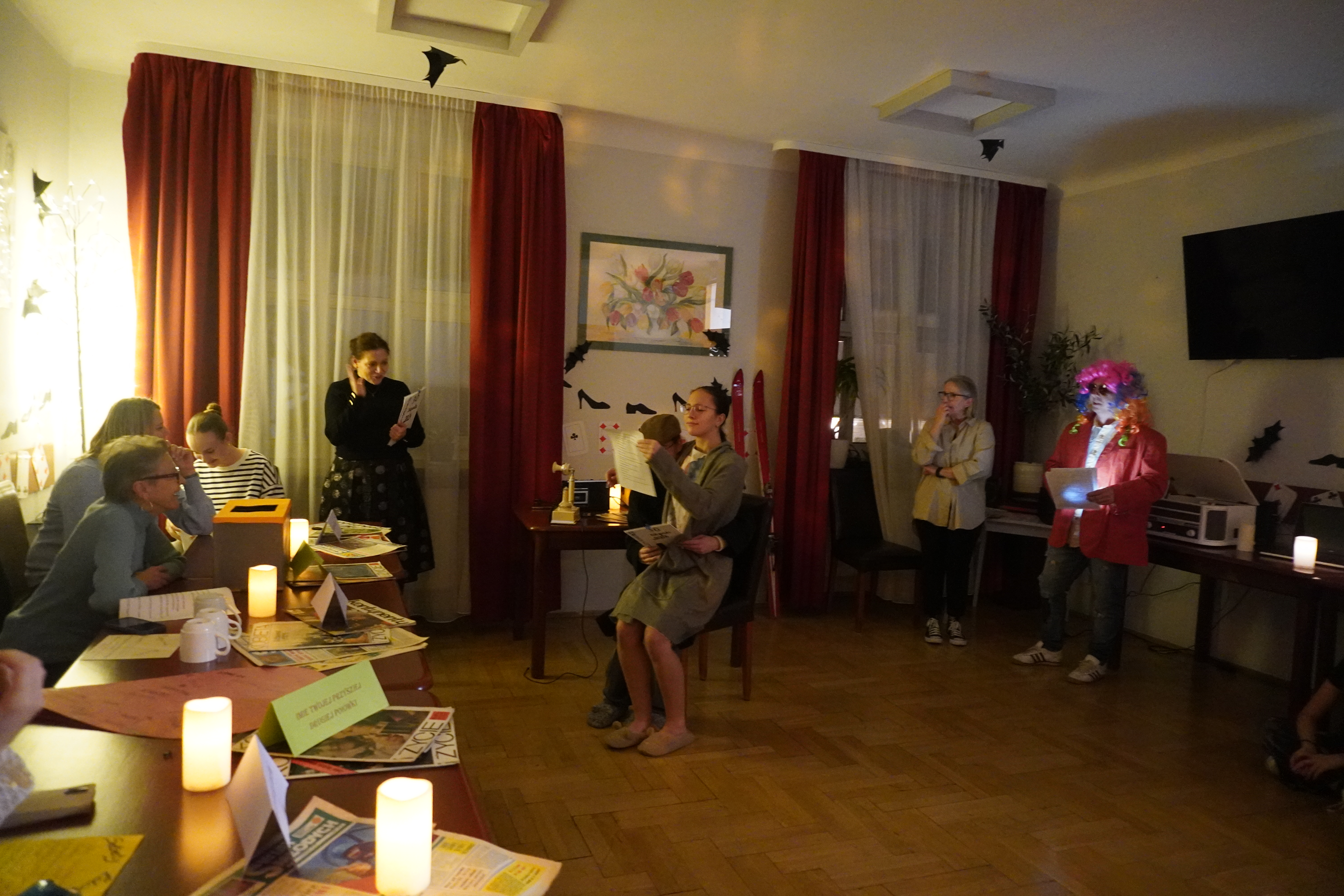 Od czasu do czasu należy się nam, artystom chwila totalnego szaleństwa i luzu. Mimo, że na co dzień zachowujemy tradycyjną kindersztubę, mamy potrzebę odciąć się choć na trochę od dnia codziennego. Tym razem w strojach z lat 80-tych udaliśmy się do jaskini wróżb przenosząc się jednocześnie w świat wczesnej młodości naszych rodziców. Czując tamten klimat, mogliśmy porozmawiać przez aparaty telefoniczne z epoki, poczytać kolorowych gazet, które odeszły już do lamusa i dowiedzieć się od wielkiego czerwonego serca jakie imię będzie miała nasza przyszła, druga połówka. Nie omieszkaliśmy również zapytać magicznych kubków, tajemniczego pudełka i kostki losu jaka czeka nas przyszłość. Przy okazji można było skosztować pysznych ciastek z wróżbą, oczywiście pozytywną!