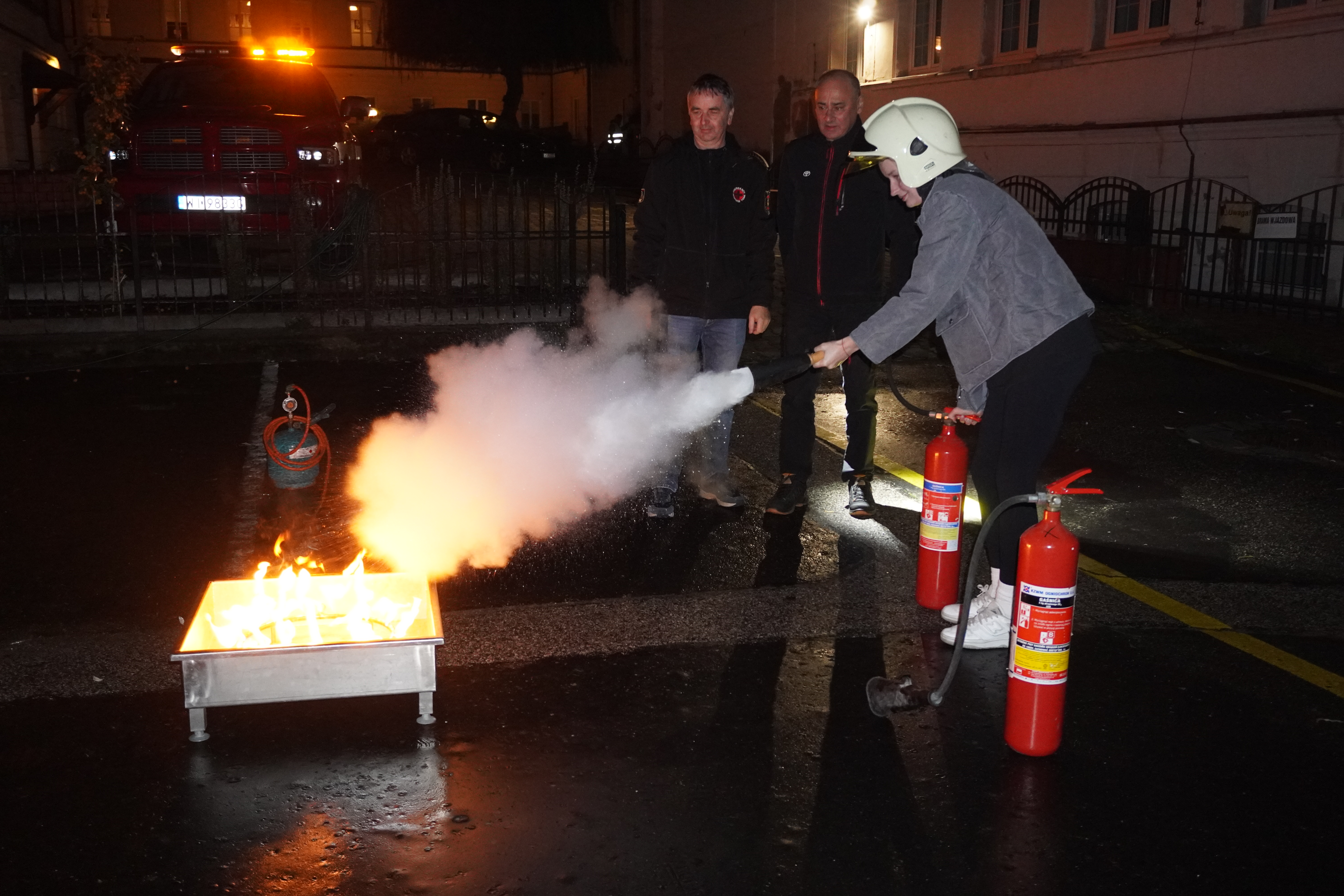 Po zakończeniu ewakuacji przygotowano dodatkową atrakcję – możliwość gaszenia kontrolowanego ognia przy użyciu gaśnicy. Jeden z wychowanków zgłosił się na ochotnika, aby wziąć udział w tej praktycznej części ćwiczeń.