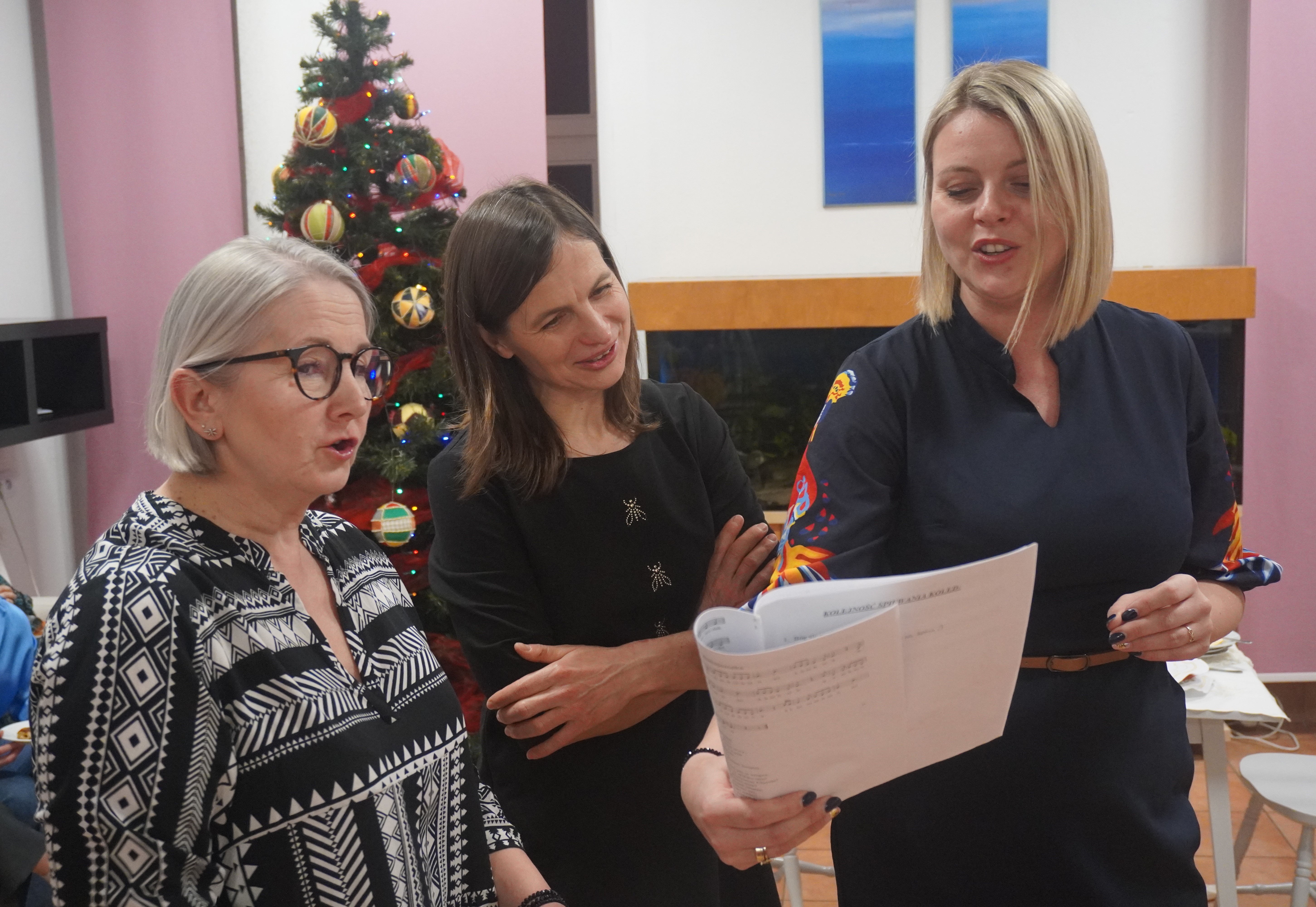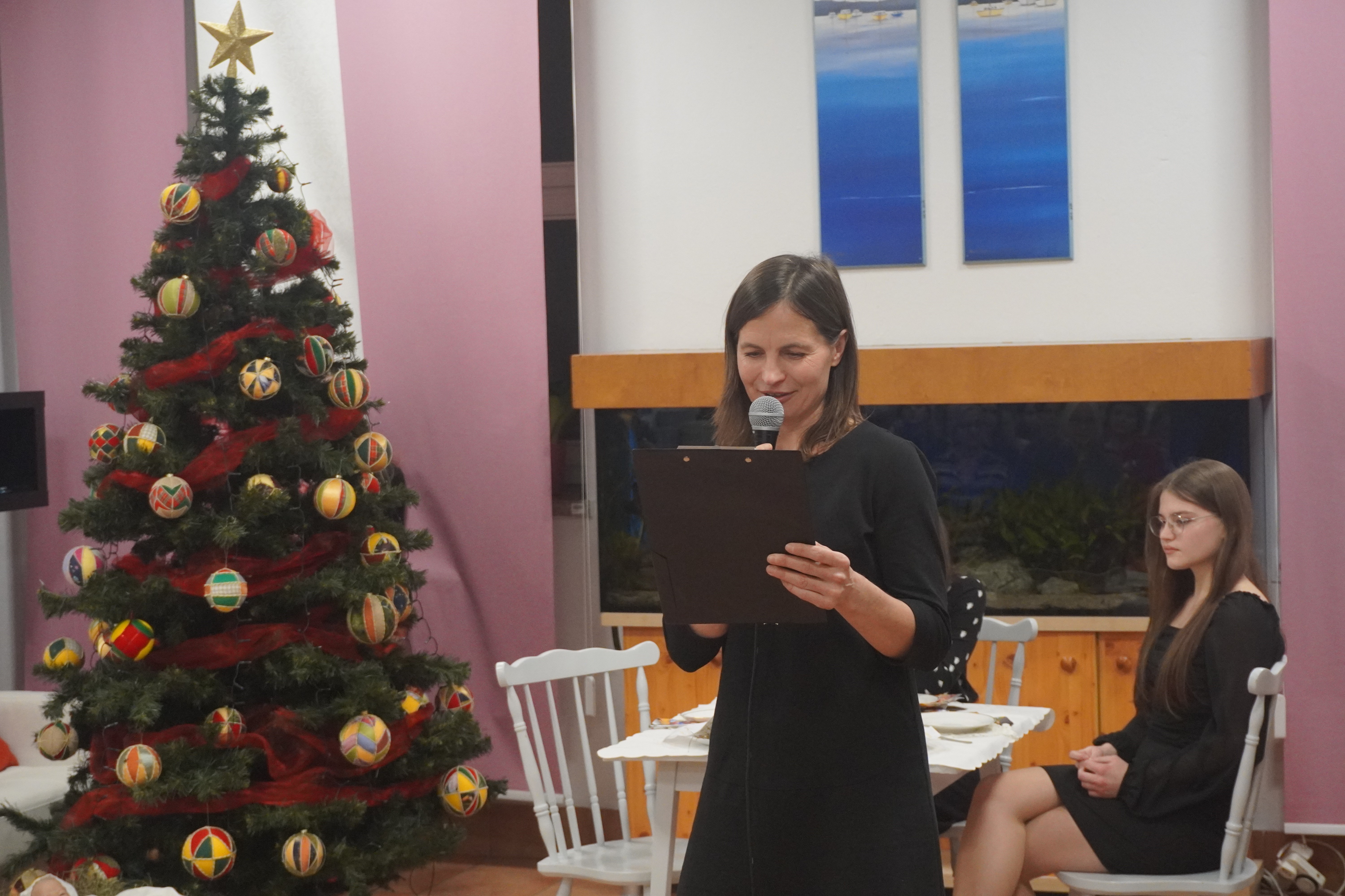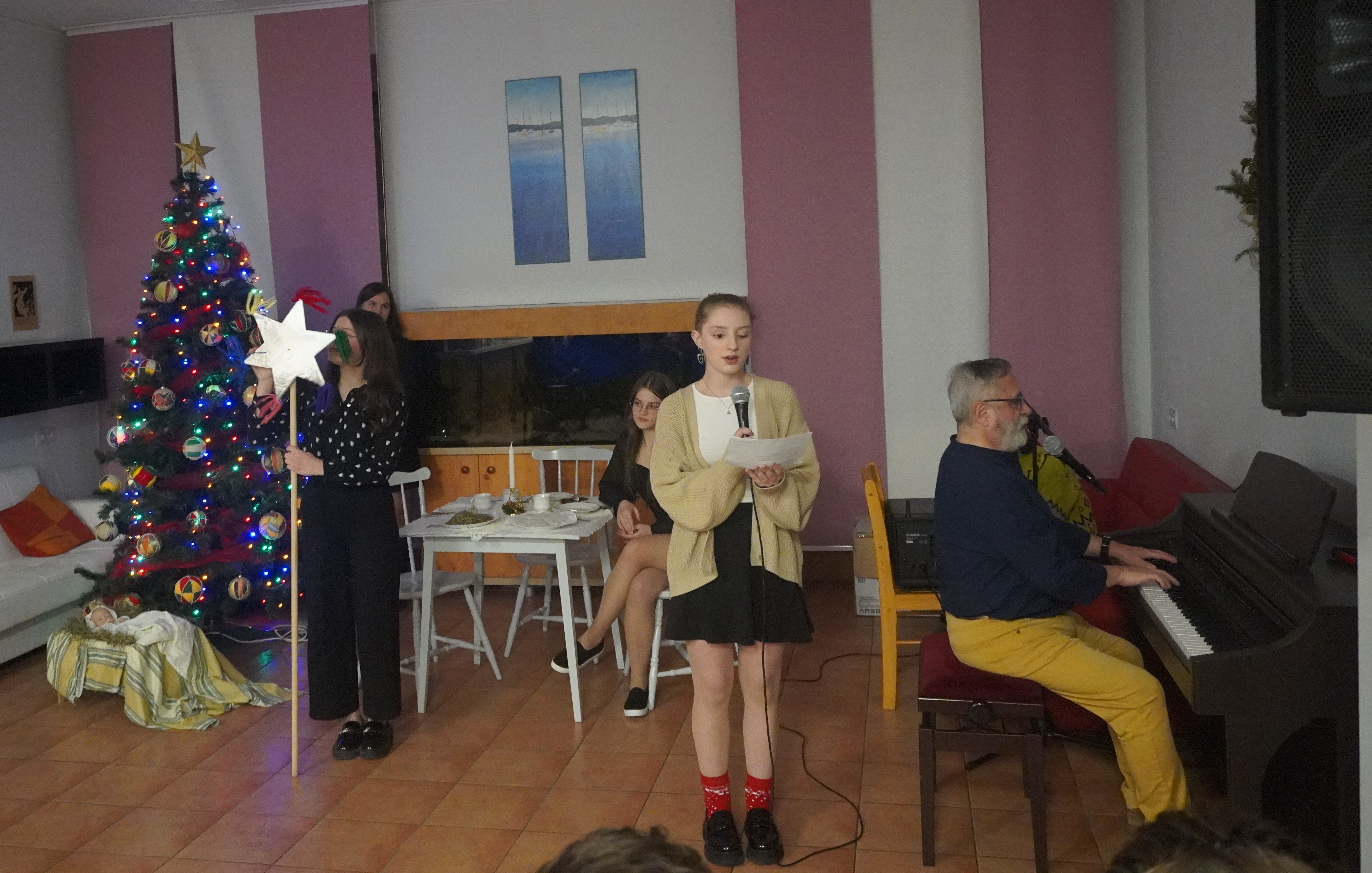W czasie krótkiego występu artystycznego przypomnieliśmy symbole świąt Bożego Narodzenia w niecodziennym wydaniu. Gościem specjalnym spotkania był pan Wojciech Maj - tata Róży, naszej wychowanki. Wraz z córką wykonał utwór swojego autorstwa pt. „Zimowa piosenka” oraz „Szarą kolędę” do słów Wojciecha Młynarskiego i muzyki Krzysztofa Komedy. Zwieńczeniem wieczoru było przemówienie Pani Dyrektor, Justyny Pupiec połączone z dzieleniem się opłatkiem i składaniem sobie życzeń. Nie zabrakło również, jak co roku, przepysznych wigilijnych potraw przygotowanych przez nasze nieocenione Panie Kucharki oraz spontanicznie śpiewanych kolęd, tym razem przy akompaniamencie Janka.