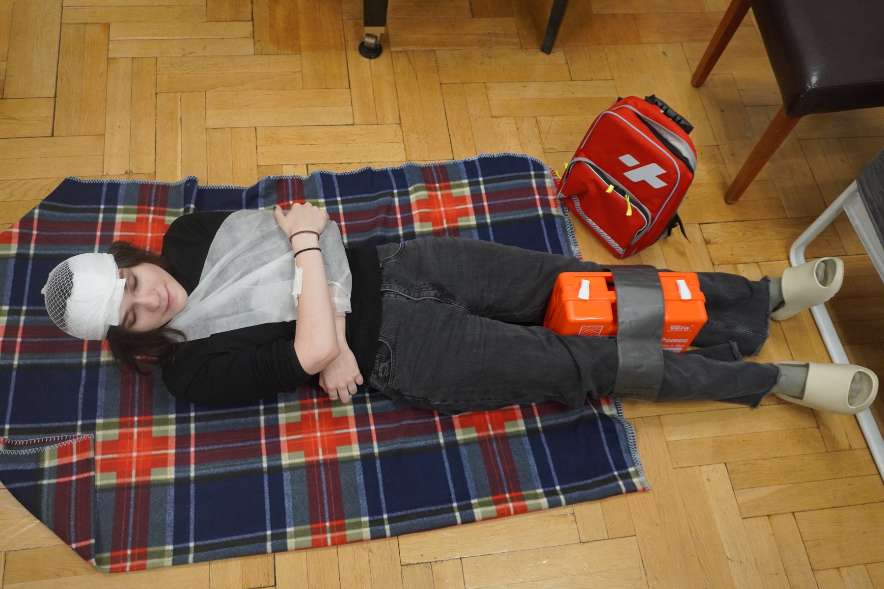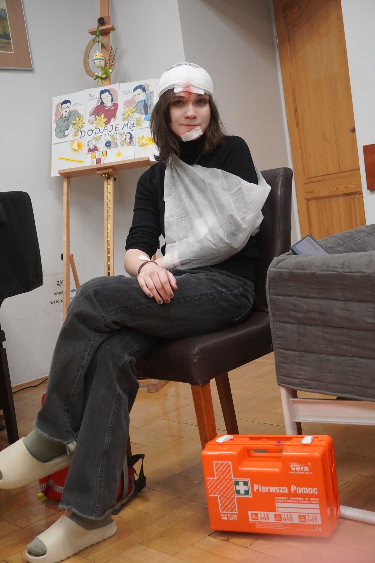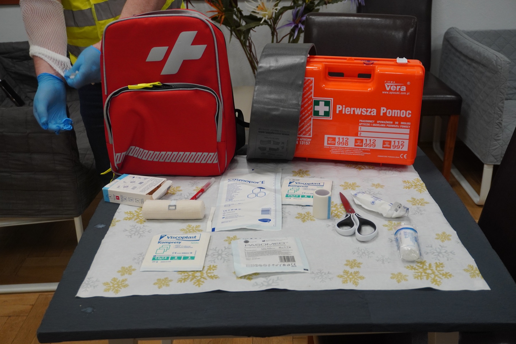 Na warsztatach wychowankowie poznali jak należy udzielić pomocy poszkodowanym osobom w przypadku złamań kończyn górnych i dolnych. Doskonalili również technikę opatrywania ran i krwotoków. Wykorzystali do tych celów zawartości znajdujące się w apteczce oraz plecaku pierwszej pomocy przedmedycznej.