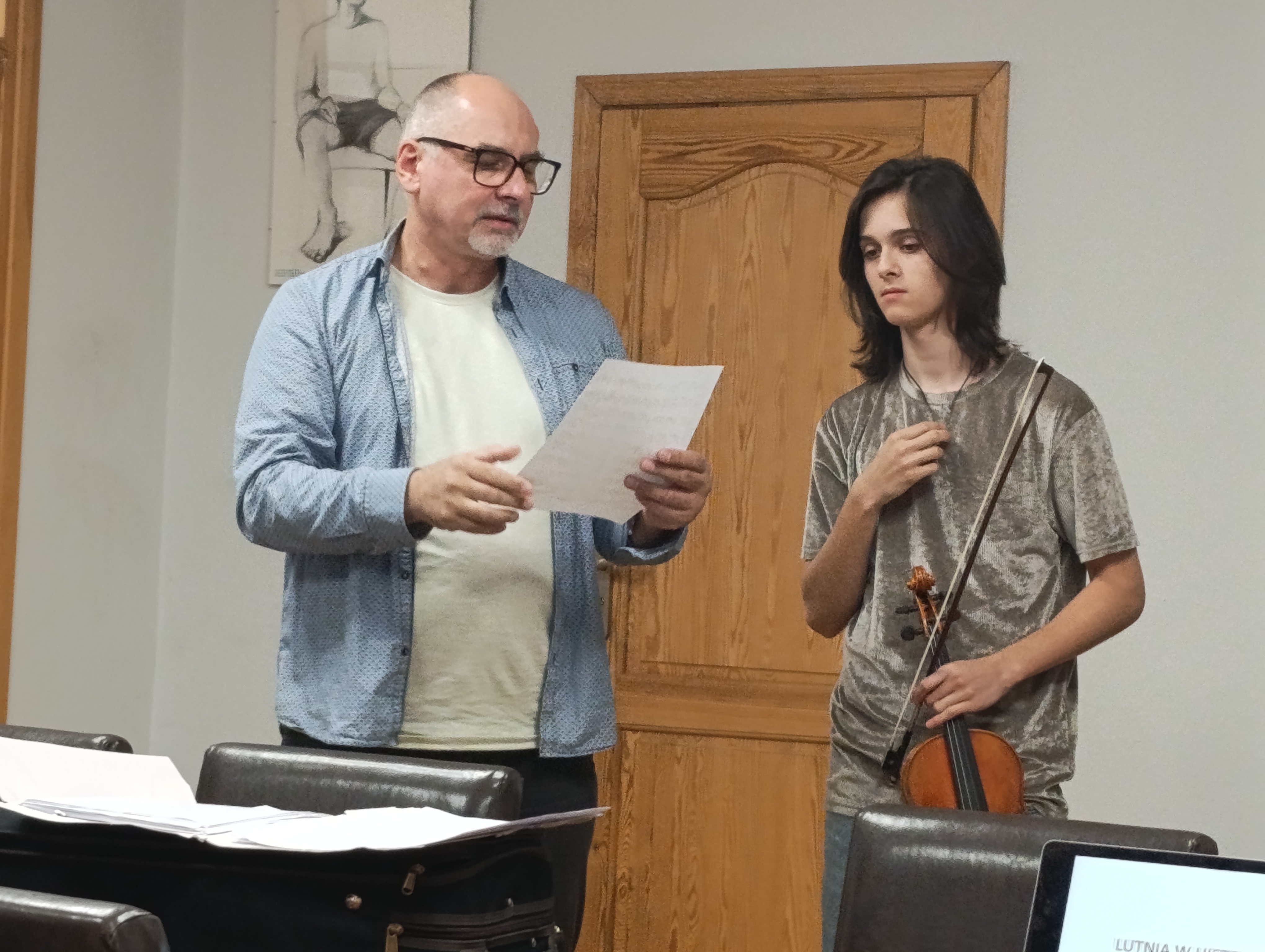 Korzystając z obecności Gościa jeden z naszych bursowych artystów, Stasiek, miał okazję zaprezentować kunszt swojej gry na skrzypcach i wysłuchać cennych wskazówek pana Henryka o swoim warsztacie pracy.