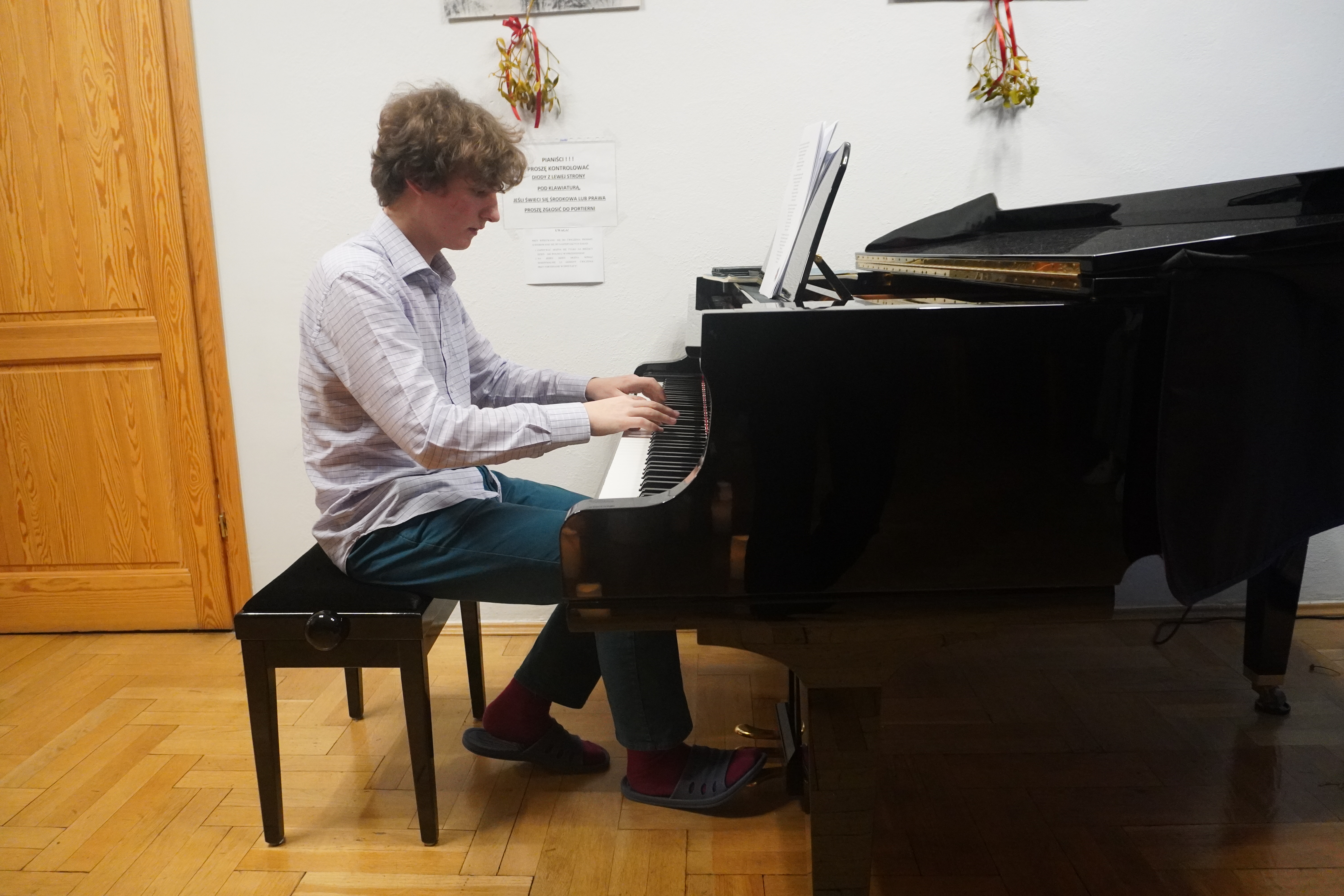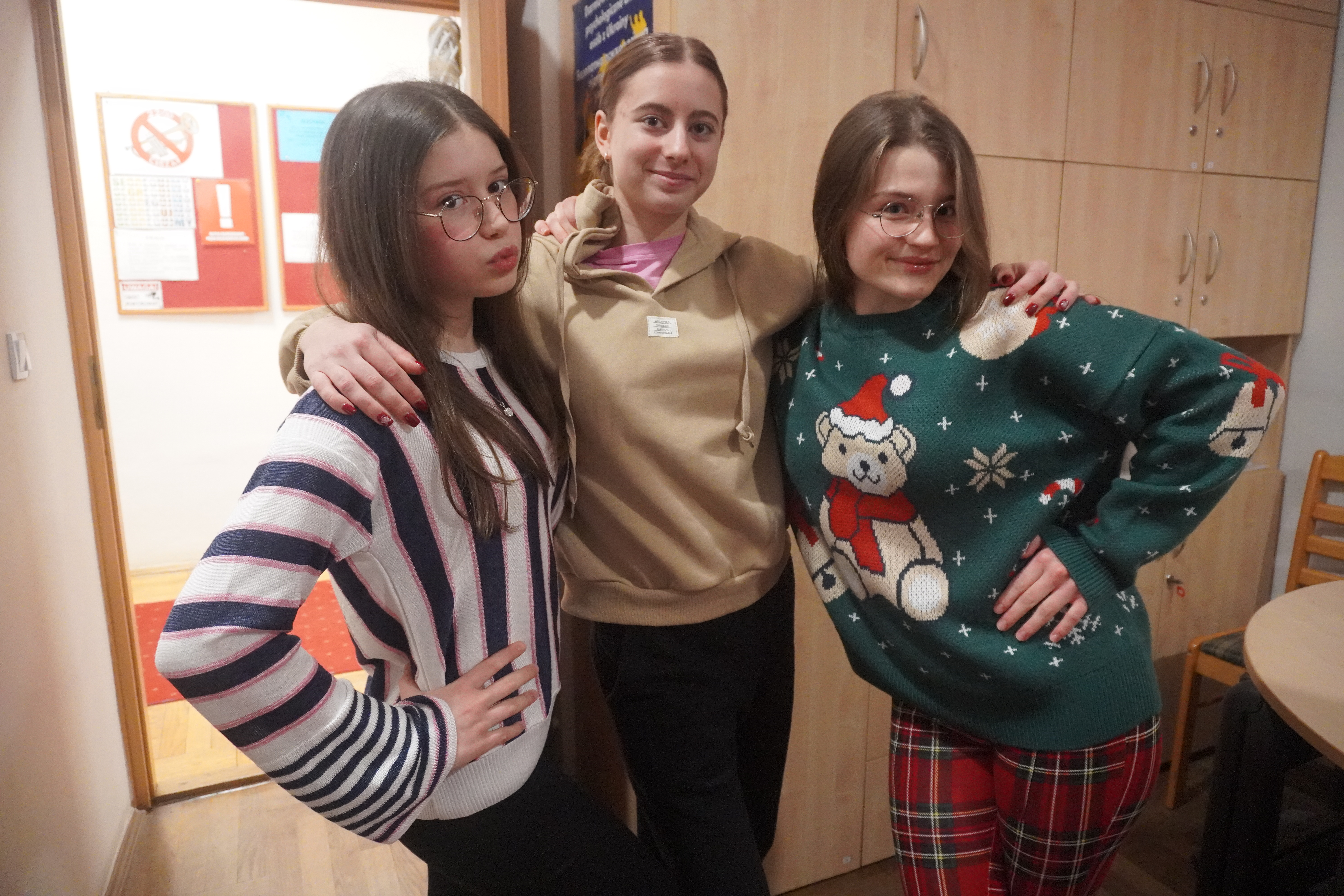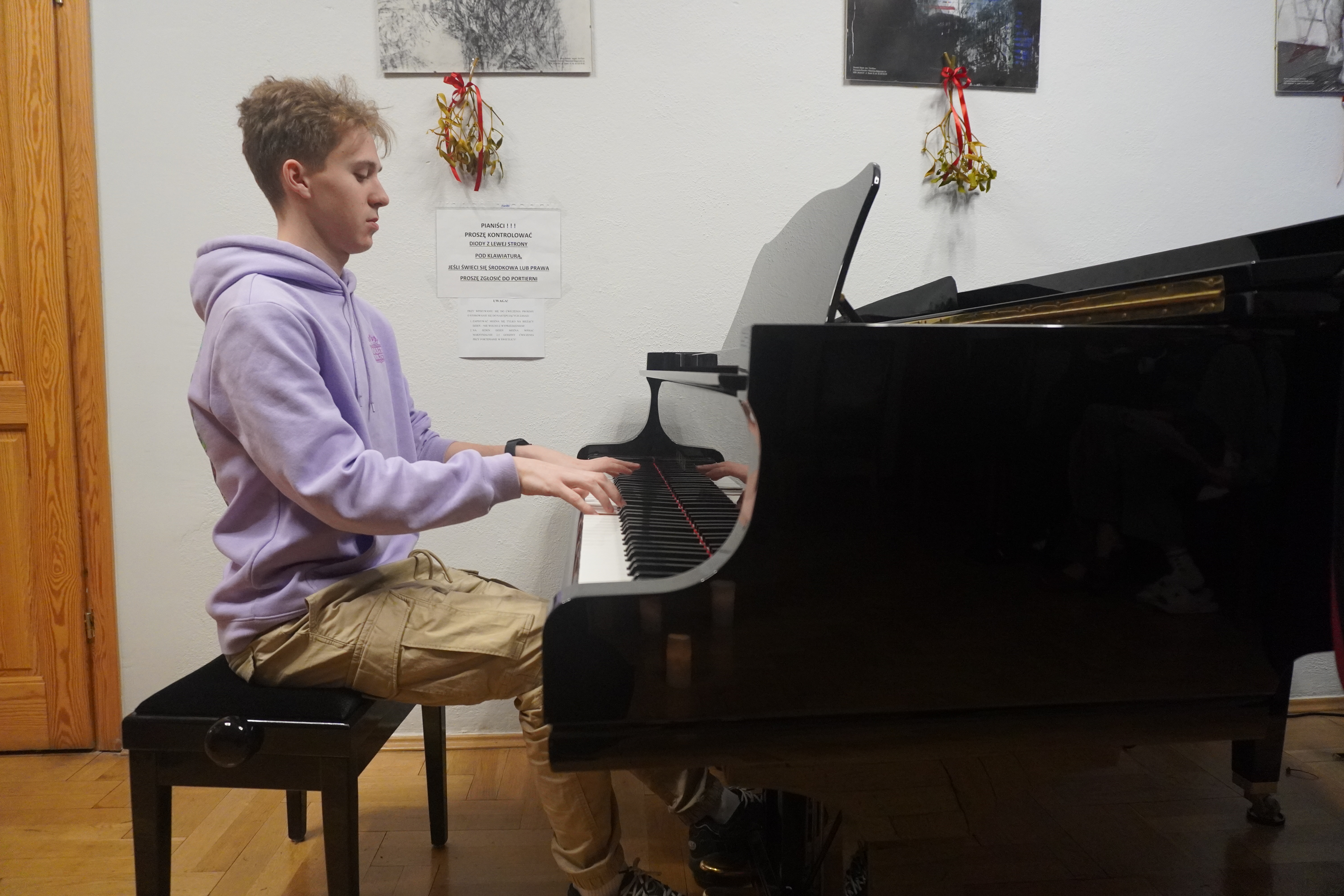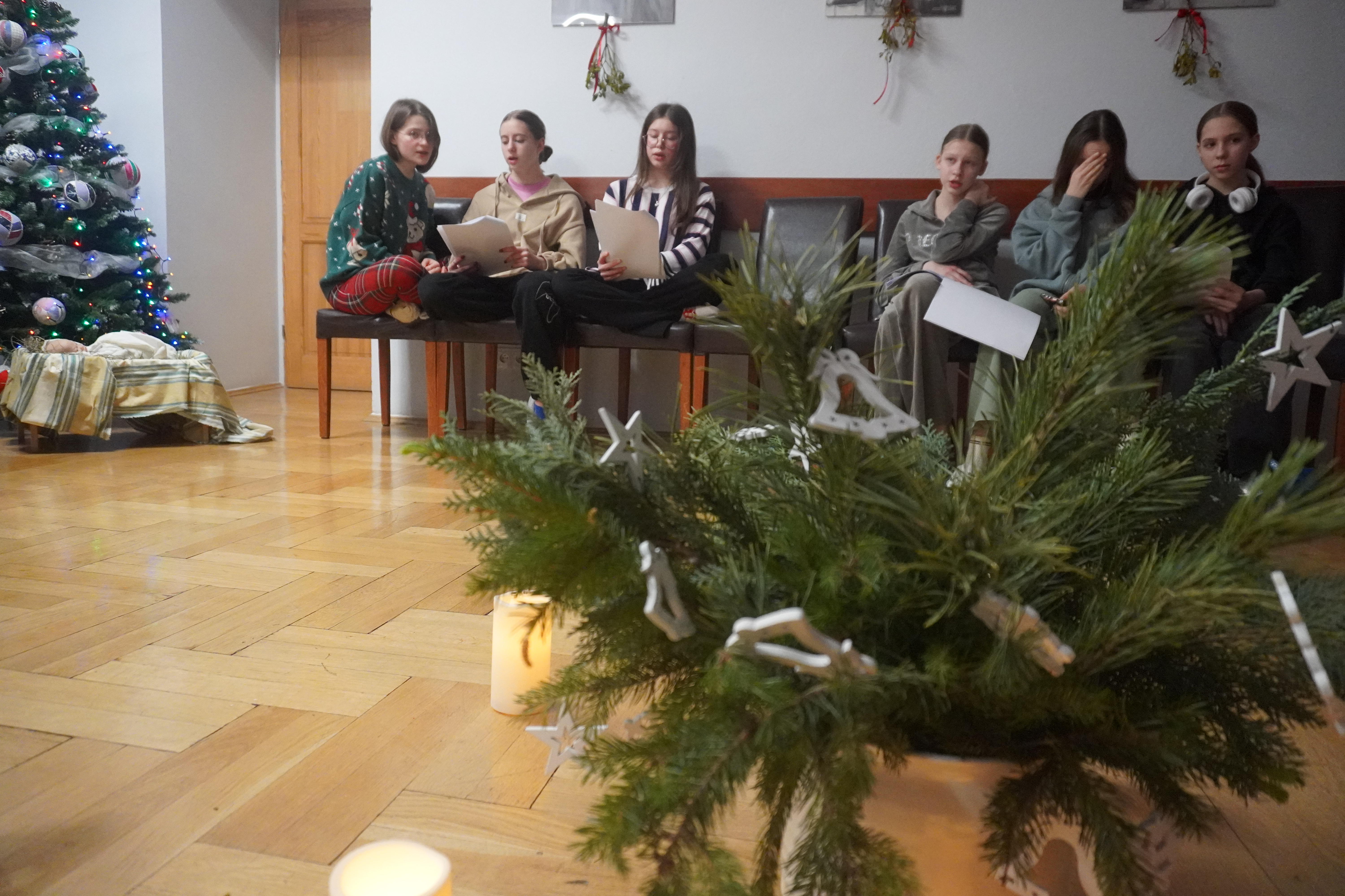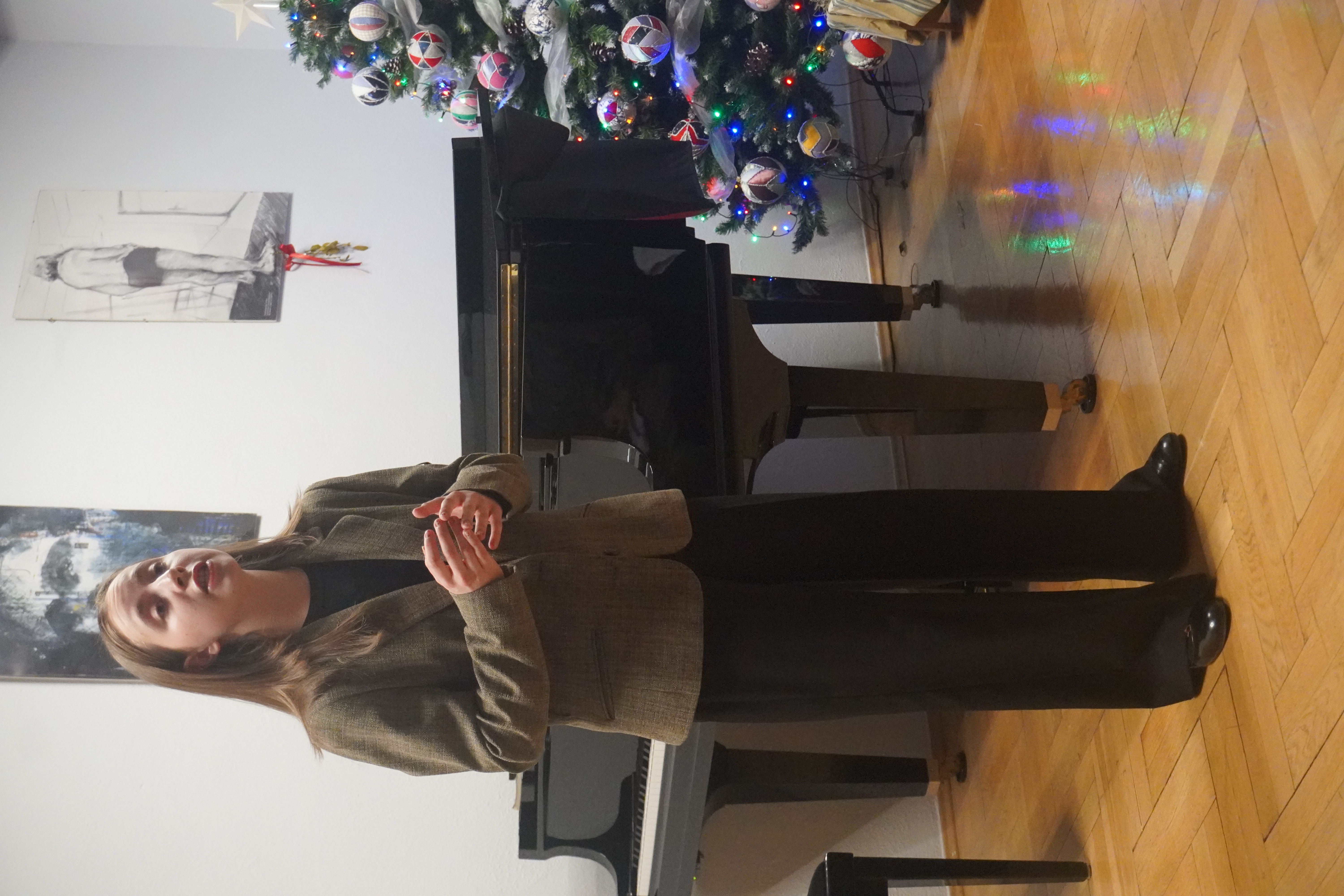 Spotkanie rozpoczęliśmy od kolędy „Wśród nocnej ciszy”, do której akompaniował przy fortepianie Filip. Pojawiła się także pastorałka „Był pastuszek bosy” oraz kolęda barokowa „A wczora z wieczora”. Nie zabrakło przepięknych kolęd w języku ukraińskim zaśpiewanych przez Solomiię, Ustynę i Anię. Wspólne śpiewanie uświetniły również piosenki świąteczne w języku angielskim, które tym razem wybrzmiały w wersji karaoke. Na zakończenie Janek, pianista brawurowo wykonał kolędę „Oj maluśki, maluśki” oraz „Cicha noc”.