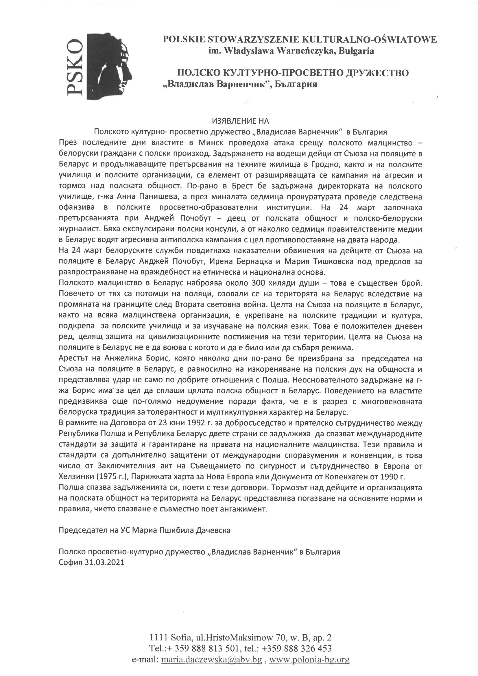 Изявление на полското културно-просветно дружество "Владислав Варненчик" в България по повод атаки в Беларус срещу полското малцинство