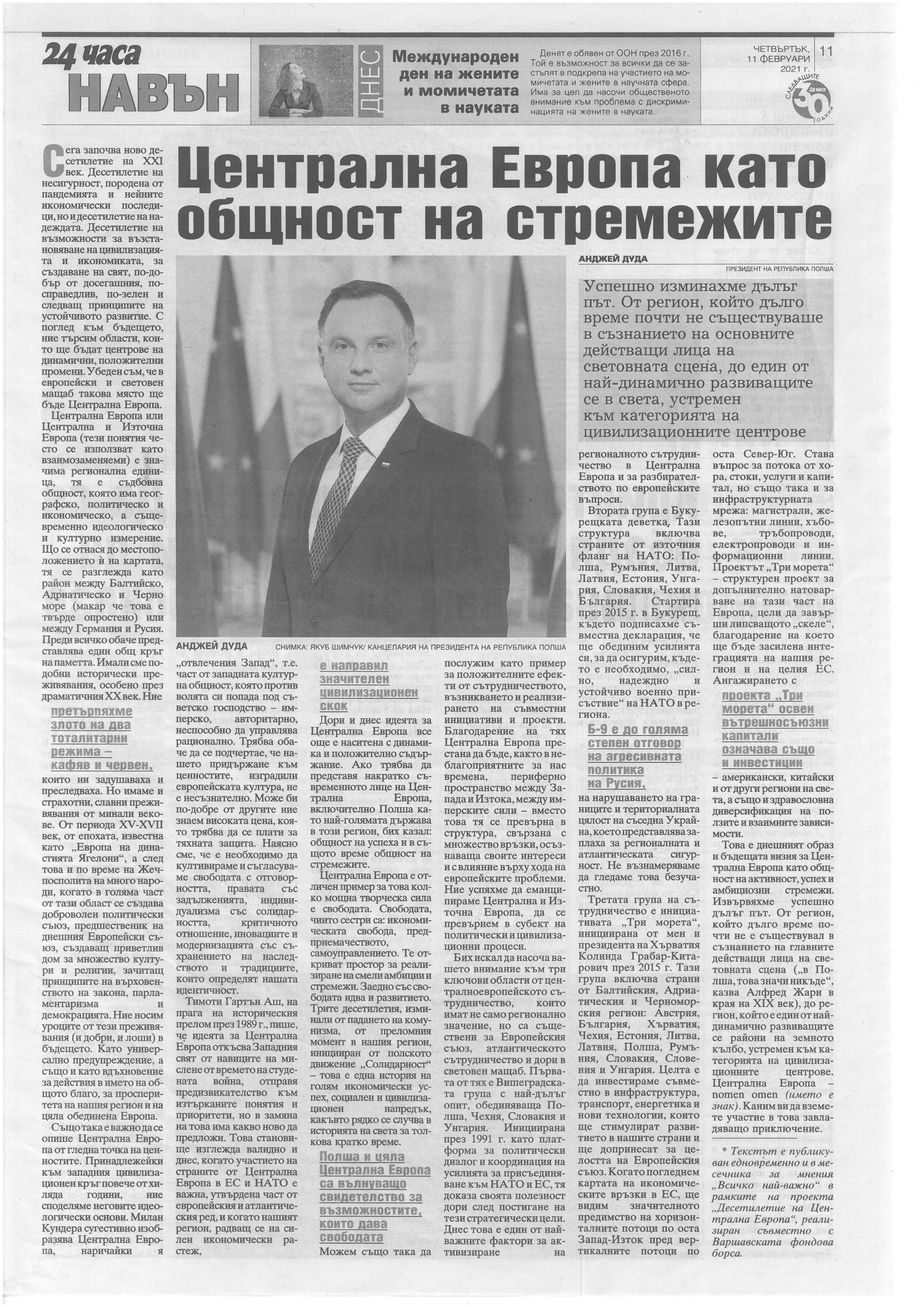Tekst artykułu Prezydenta RP ukazał się w bułgarskim dzienniku „24 czasa” (24 часа), 11 lutego 2021 r.