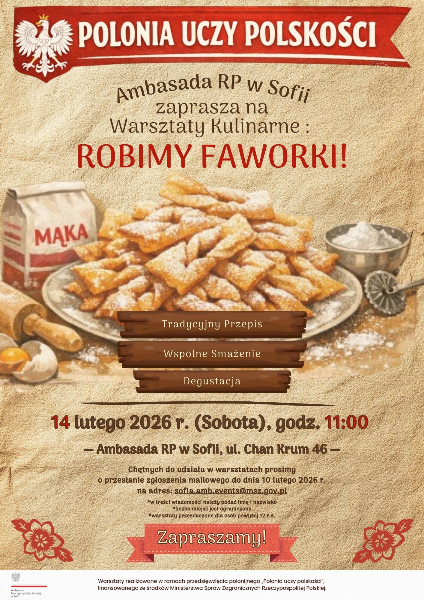 Serdecznie zapraszamy na wyjątkowe warsztaty kulinarne poświęcone tradycyjnym faworkom, organizowane w ramach cyklu „Polonia uczy polskości”.