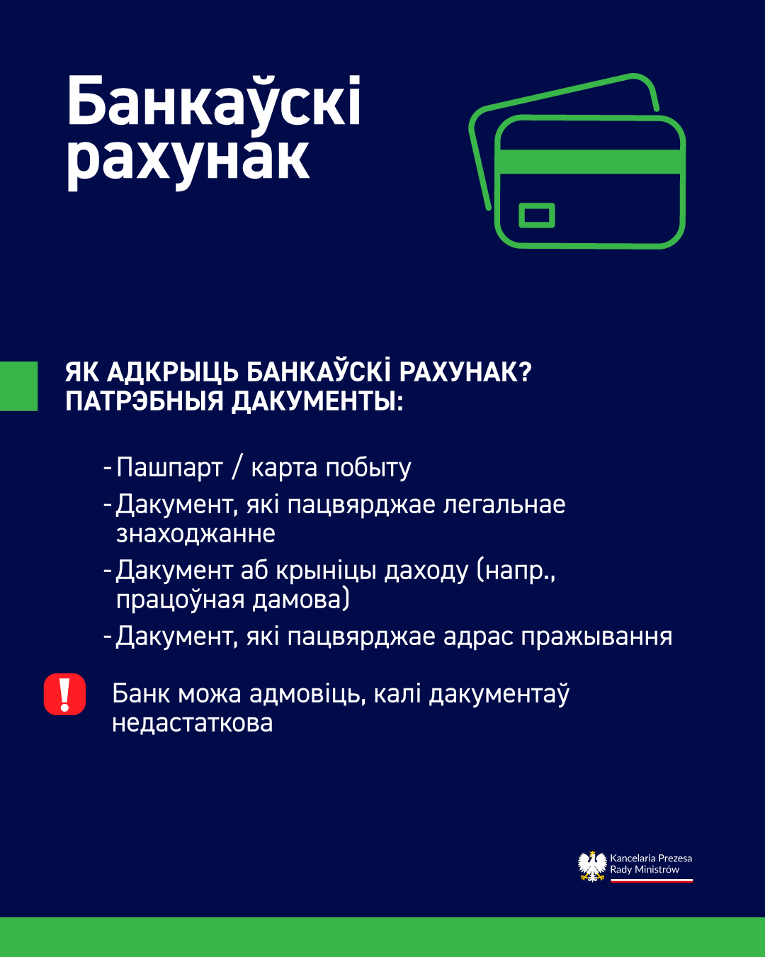 Увага: Спіс дакументаў, якія патрабуюцца, можа адрознівацца ў залежнасці ад банка. Не кожны банк патрабуе прад'яўлення ўсіх ніжэйпералічаных дакументаў – гэты пералік мае прыкладны характар. Рэкамендуем праверыць падрабязныя патрабаванні непасрэдна ў выбраным банку або на яго інтэрнэт-старонцы.