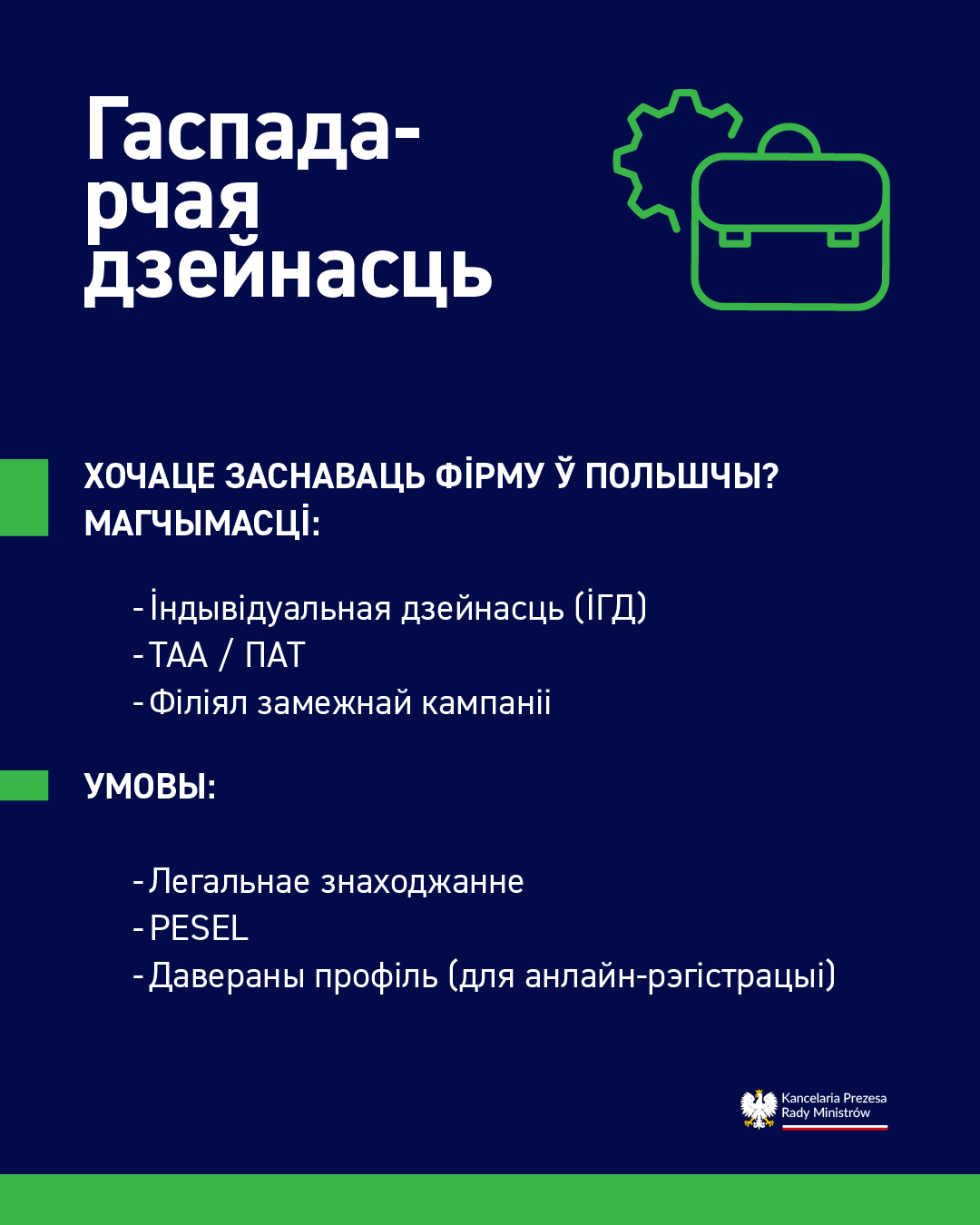 Грамадзяне Беларусі могуць весці гаспадарчую дзейнасць у Польшчы пры ўмове наяўнасці адпаведнага статусу знаходжання, такога як карта побыту, карта доўгатэрміновага рэзідэнта ЕС, Карта паляка, а таксама рэгістрацыi і нумару PESEL. Гэта датычыцца таксама асоб, якія маюць статус бежанца або дадатковую абарону. Дазволеныя формы – гэта, між іншым, індывідуальная гаспадарчая дзейнасць (ІГД), асабовыя (osobowe) і капітальныя (kapitałowe) таварыствы (напр., Таварыства з абмежаванай адказнасцю), а таксама філіялы замежных кампаній.