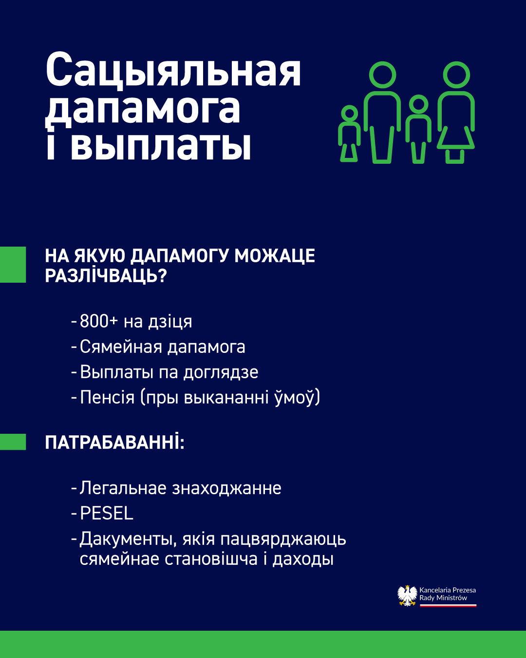 Грамадзяне Беларусі, як і іншыя замежнікі з трэціх краін, могуць прэтэндаваць у Польшчы на сямейныя выплаты пры ўмове адпаведнасці пэўным крытэрыям. Гэтыя правы вынікаюць з польскіх законаў, у тым ліку: