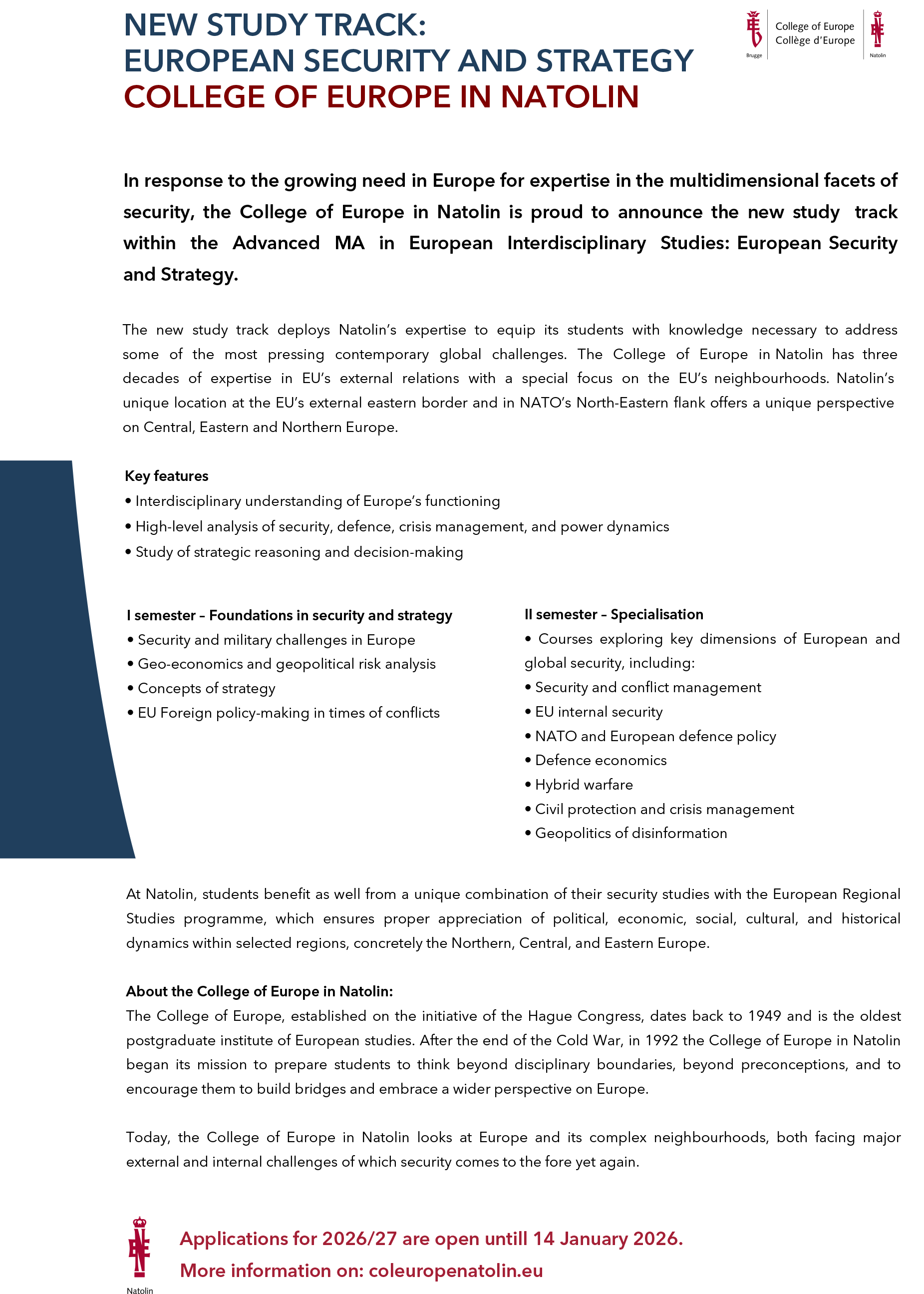 The College of Europe has opened applications for its postgraduate programmes for the 2026/27 academic year. In response to the growing need in Europe for experts in security, the College of Europe in Natolin is proud to announce the new study track within the Advanced MA in European Interdisciplinary Studies: European Security and Strategy. Candidates have until 14 January 2026 to submit their online application.