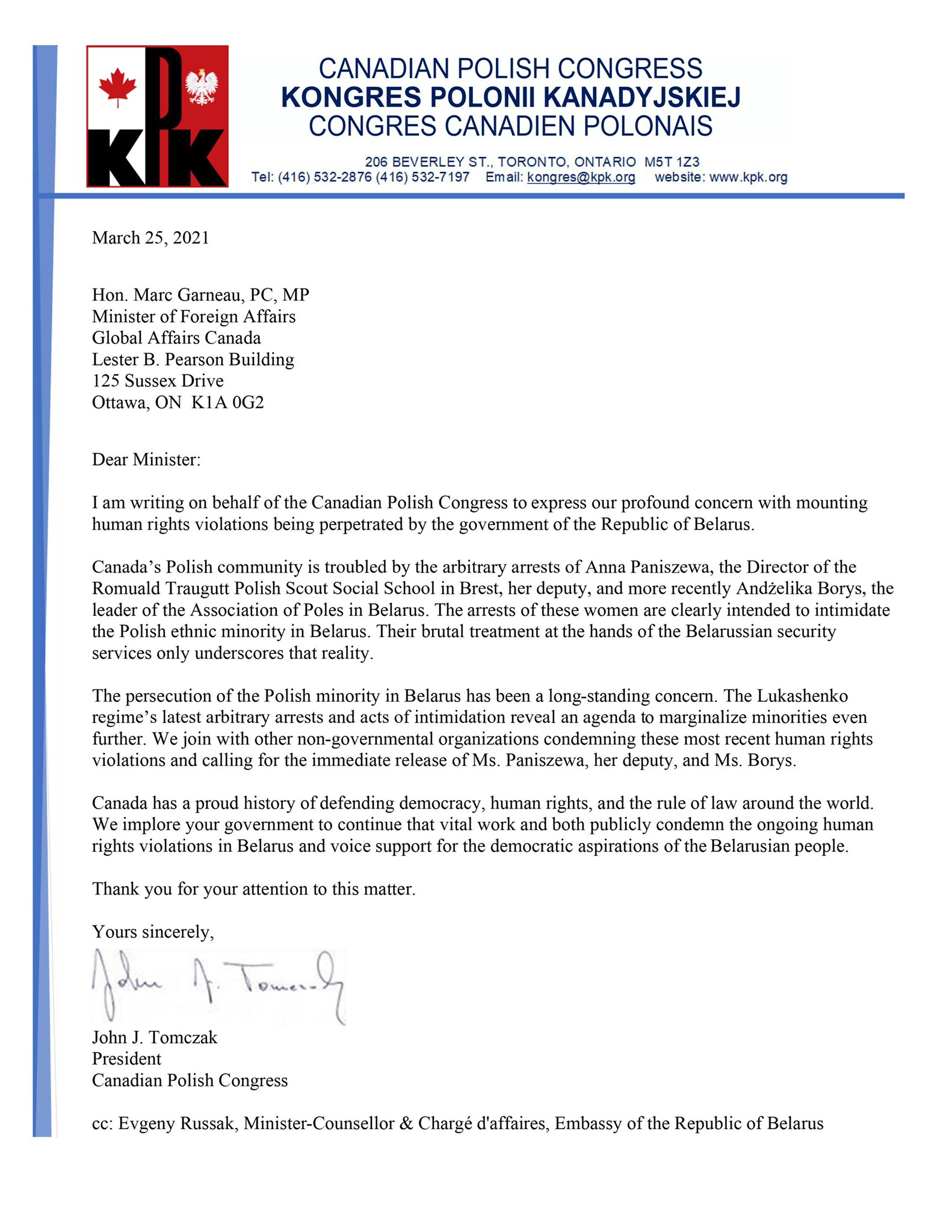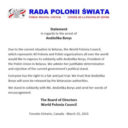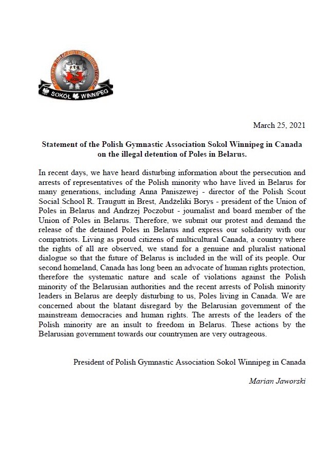 Polish organizations in Canada send words of support and solidarity with Poles in Belarus.