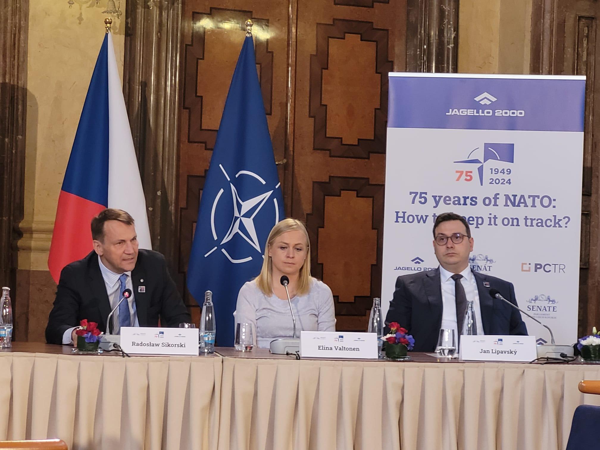 Před neformálním zasedáním ministrů zahraničí NATO se v sídle českého Senátu uskutečnila veřejná debata, které se zúčastnili ministr Radoslaw Sikorski, český ministr zahraničí Jan Lipavský a finská ministryně zahraničí Elina Valtonen. Po diskusi vystoupil s projevem generální tajemník NATO Jens Stoltenberg. Setkání hostil předseda Senátu Parlamentu ČR Miloš Vystrčil a spolupořádalo je spolek Jagello 2000. Ministr Sikorski prohlásil, že mír na Ukrajině by mohl být nastolen „během pěti minut“. - závisí pouze na prezidentu Putinovi, aby nařídil ukončení bojů a návrat ruských vojsk za mezinárodně uznané hranice Ukrajiny. Ministr rovněž zdůraznil, že pokud budou ruské hybridní útoky sílit, bude nutné zpřísnit kroky proti Rusku. Ocenil českou iniciativu na omezení mobility ruských diplomatů v schengenském prostoru jako inspiraci pro polská řešení na národní úrovni. Debatu vysílala veřejnoprávní Česká televize (ČT24) a zahraniční média (mj. Polsat, DW News). Na česko-polské aspekty u příležitosti ministerského setkání upozornil také rozhovor ministra Sikorského pro zpravodajství veřejnoprávní televize ČT24.