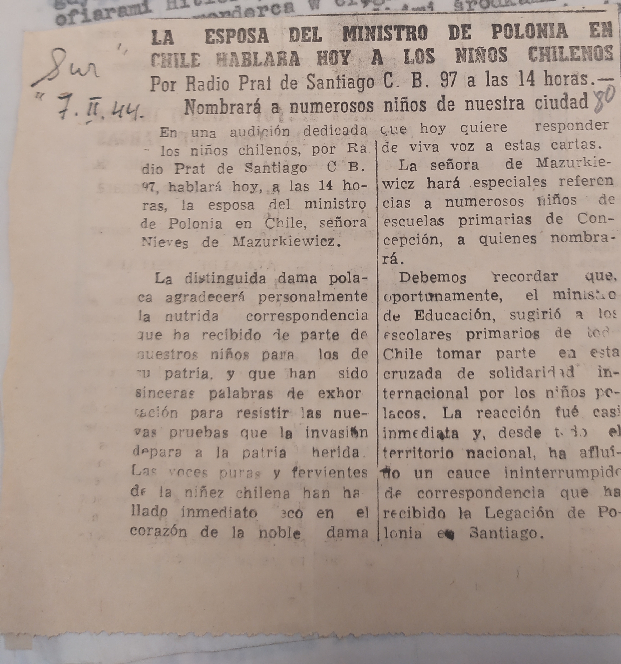 Los tiempos de la Segunda Guerra Mundial fueron trágicos para los niños polacos. Por iniciativa del Ministerio de Educación de Chile, los niños de las escuelas chilenas escribieron cartas y enviaron obras de arte como muestra de solidaridad a los niños de Polonia. Estos documentos se encuentran actualmente en los Archivos de Actos Nuevos de Varsovia, en la colección « Legación Polaca en Santiago».