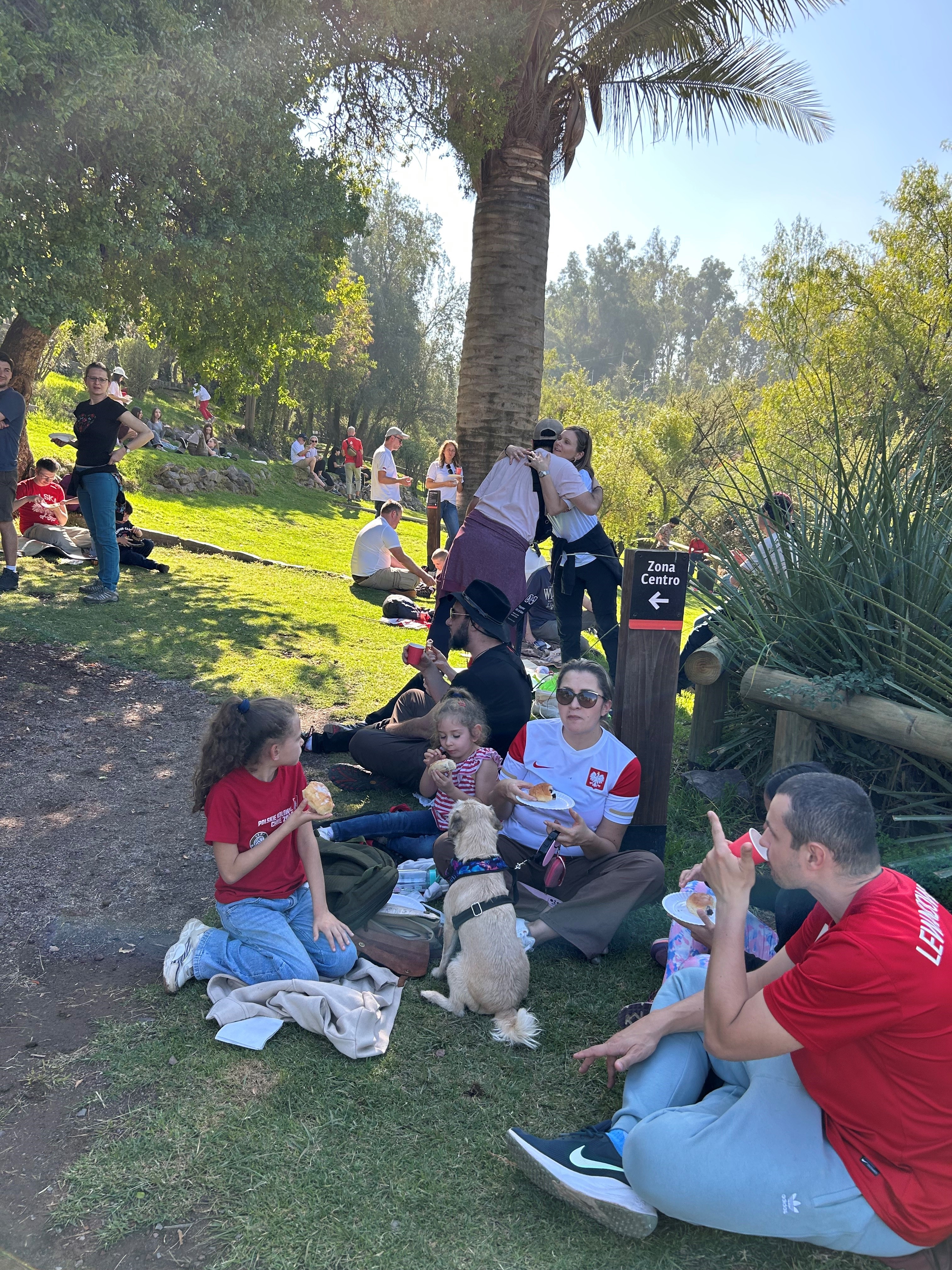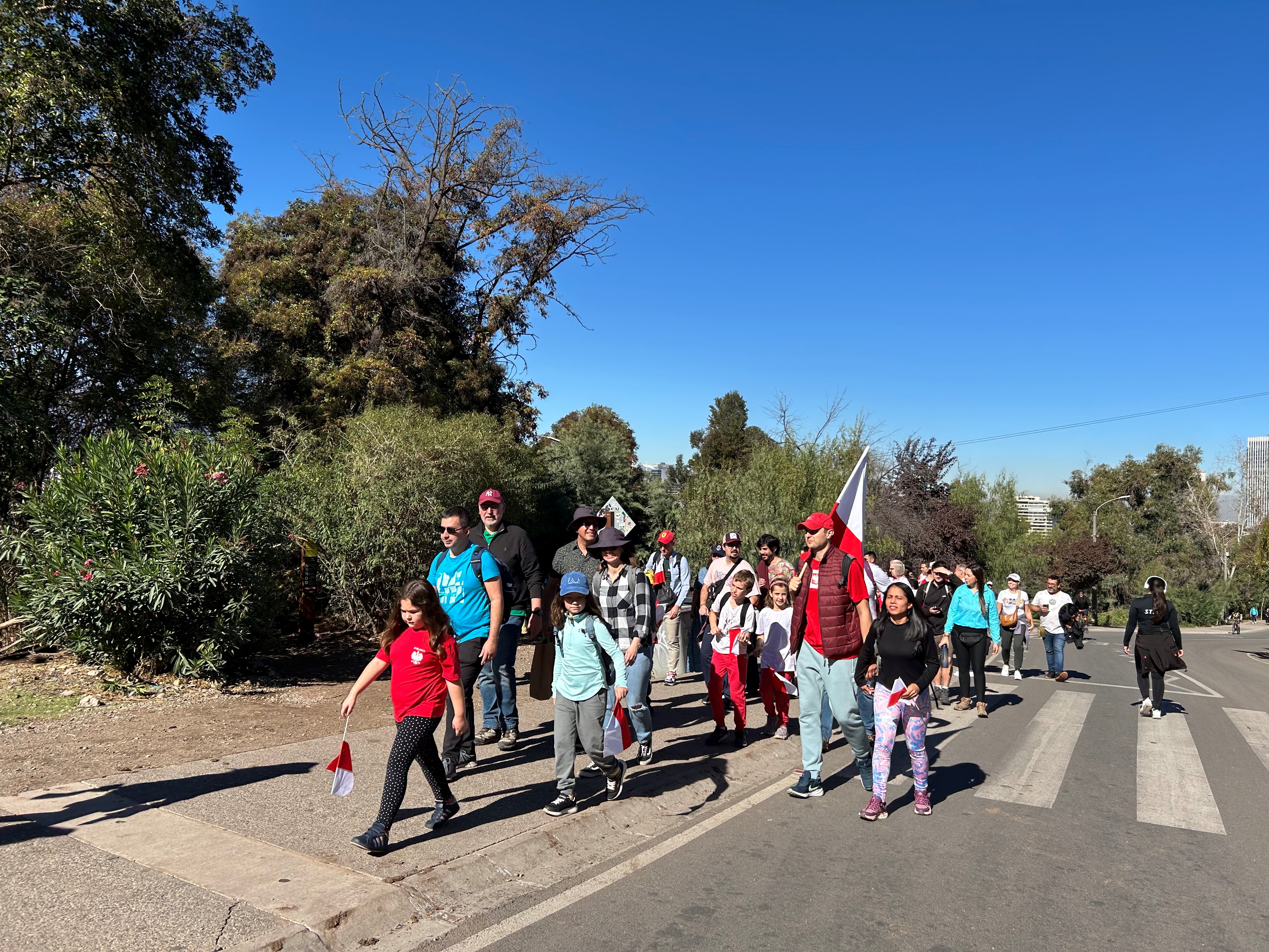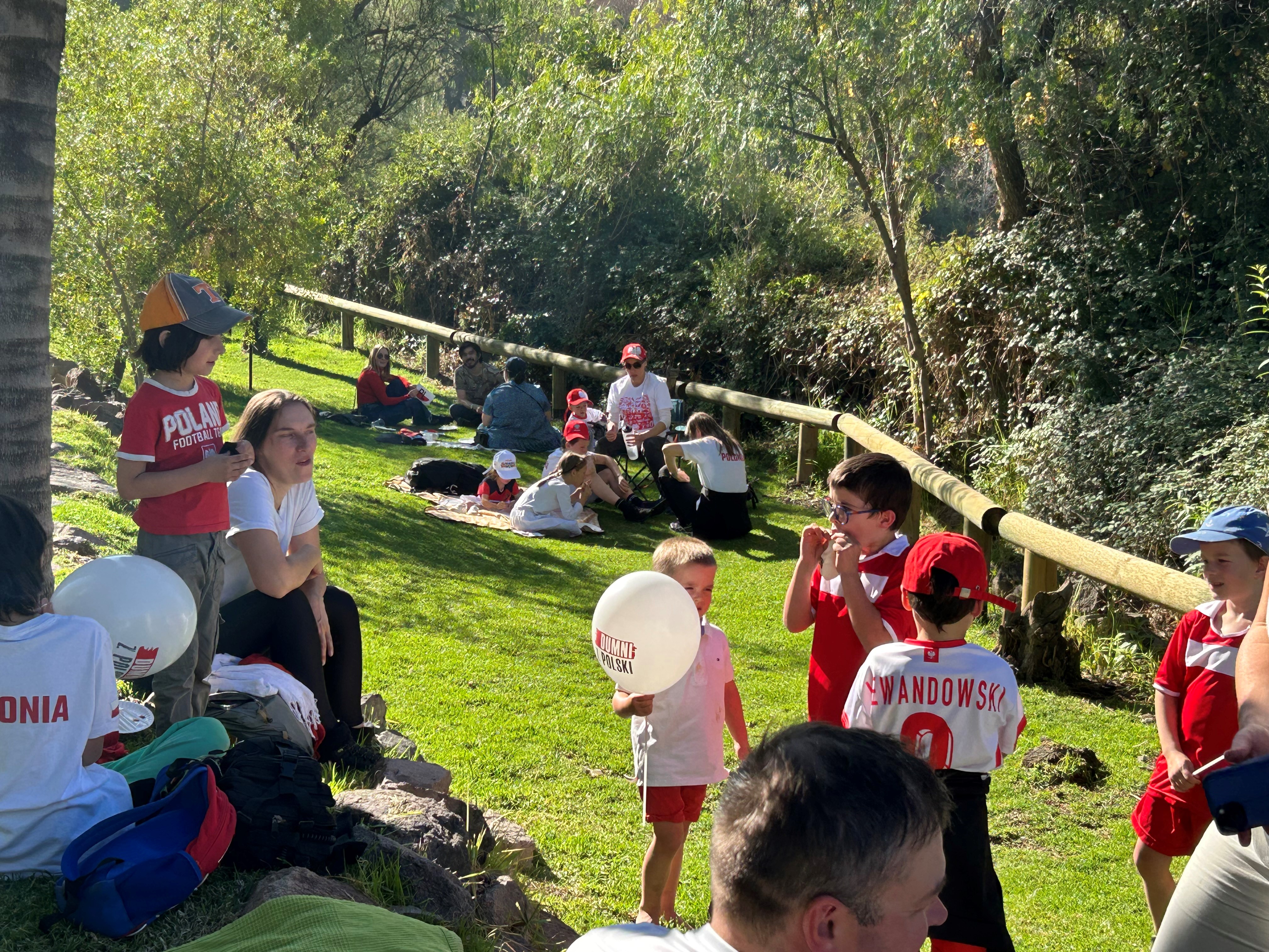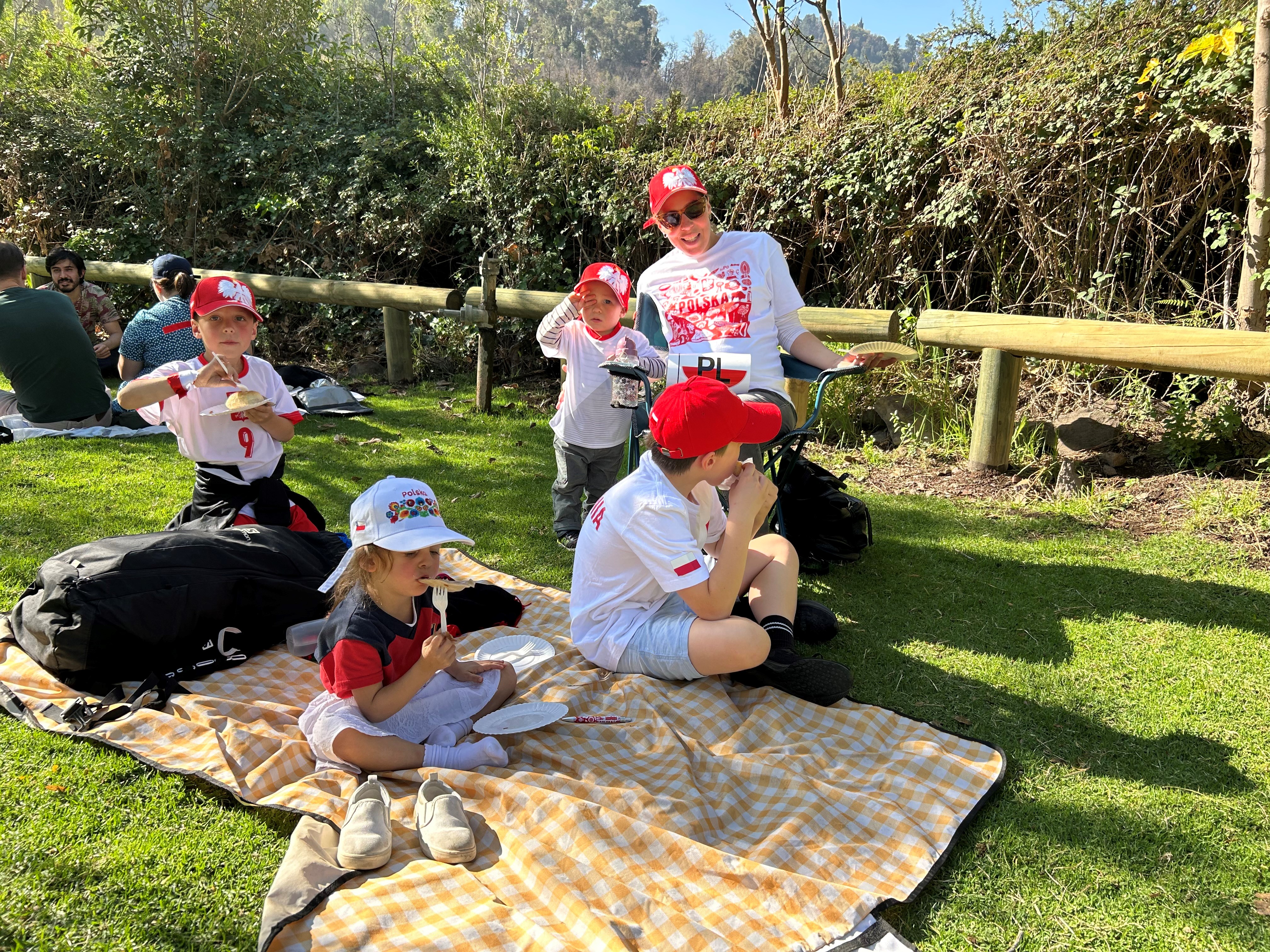 Comenzamos el dia con una caminata al cerro San Cristóbal, desde donde pudimos admirar hermosas vistas de Santiago, para luego ir a hacer un picnic en el Jardín Mapulemu. La bandera polaca ondeando despertó interés entre los chilenos. Disfraces blancos y rojos, deliciosos pierogi, pan dulce de arándanos, conversaciones en polaco y juegos infantiles hicieron que la atmósfera del picnic fuera verdaderamente polaca.