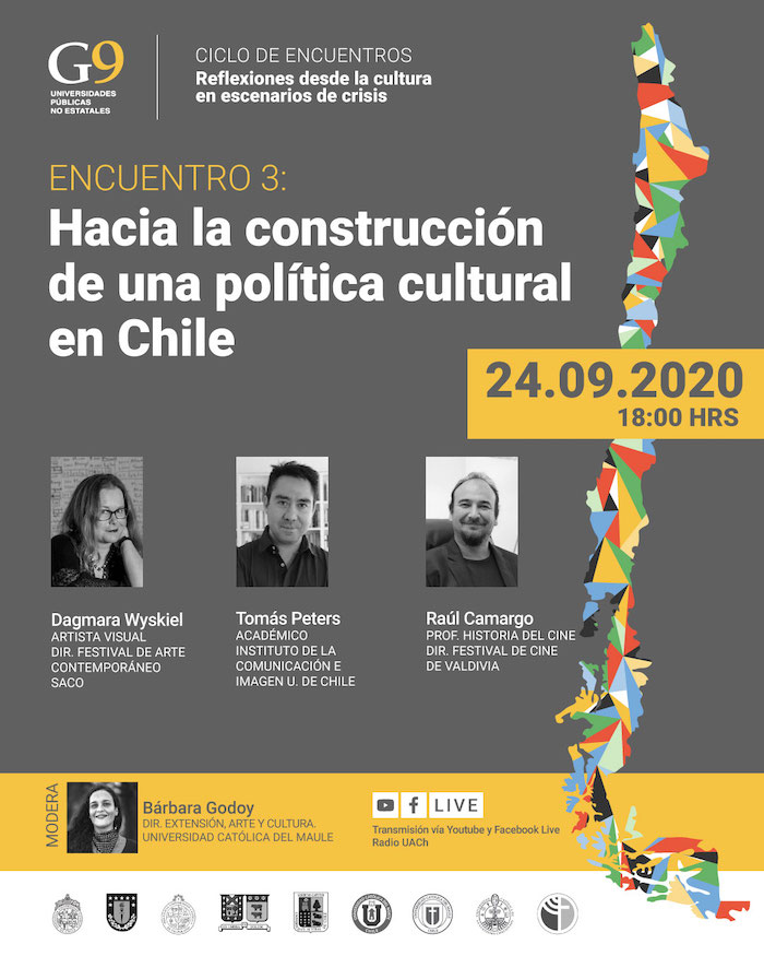 Invitamos a un encuentro sobre la política cultural con la participación de Dagmara Wyskiel, Doctora de Artes Visuales de la Universidad de Bellas Artes de Cracovia y directora del Festival de Arte Contemporáneo SACO. La presentación de Dagmara titulada “Sinuosos senderos de una política cultural deseable” será acompañada por una exposición de Tomás Peters acerca de los 30 años de la política cultural en Chile y otra de Raúl Camargo sobre festivales de cine.