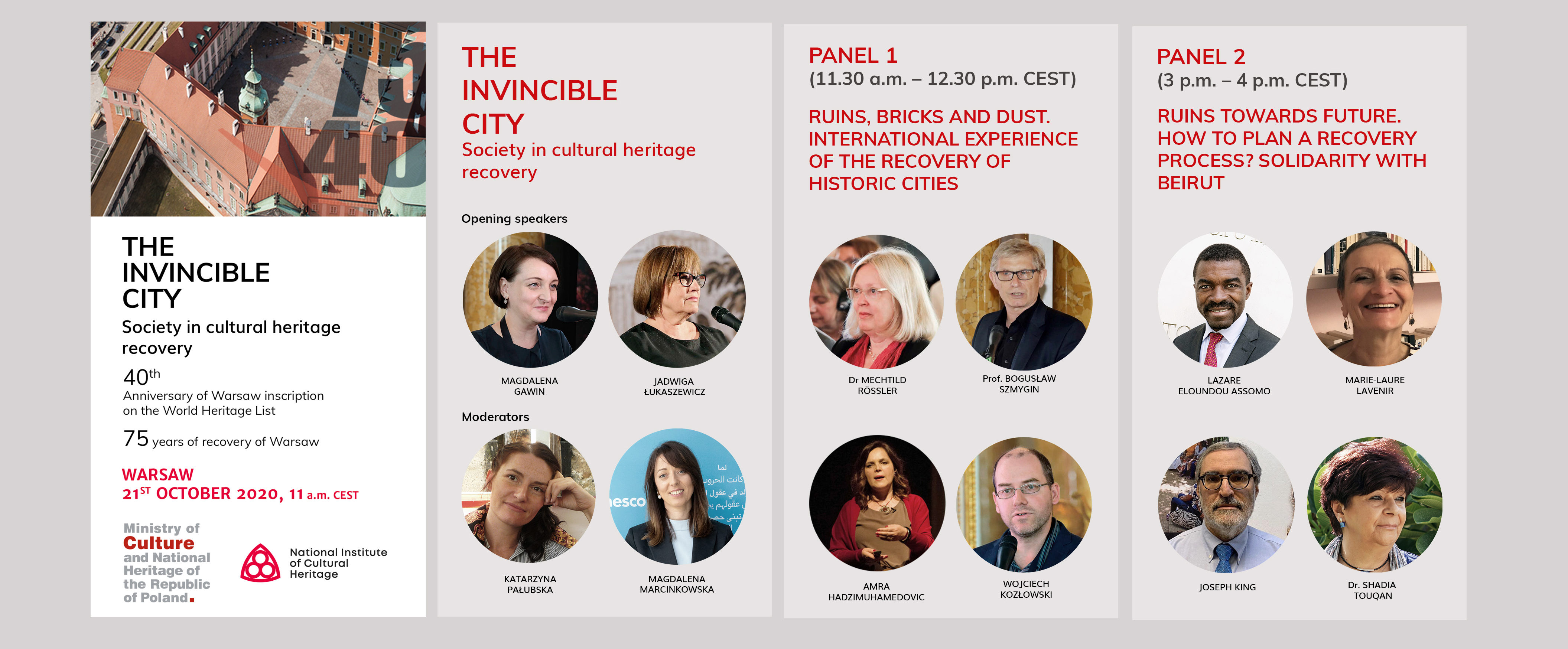 Invitamos al webinar "The invincible city. Society in cultural heritage recovery" dedicado a la conservación y a la reconstrucción del patrimonio cultural. El evento es organizado con motivo de celebrar 40 años desde la incorporación del "Centro Histórico de Varsovia" en la lista del Patrimonio de la Humanidad de la UNESCO y 75 años desde su reconstrucción, y se realizará el 21 de octubre. La conferencia surge de la iniciativa del Ministerio de la Cultura y del Patrimonio Nacional de Polonia y contará con la participación de expertos del Centro del Patrimonio Mundial de la UNESCO, del Consejo Internacional de la Protección de Monumentos (ICOMOS), del Centro Internacional de Investigación sobre la Protección y Conservación del Patrimonio Cultural (ICCROM) y del Instituto Nacional del Patrimonio.
