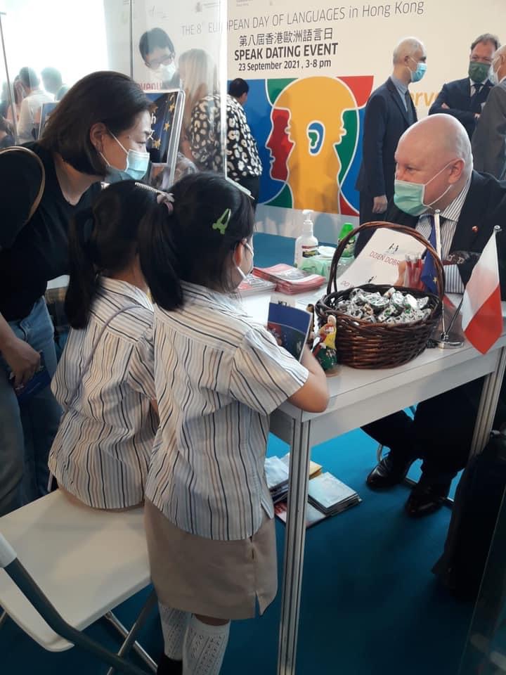 23 września br. konsulaty generalne oraz instytuty kultury państw członkowskich UE wraz z Biurem Unii Europejskiej w Hongkongu i Makau zorganizowały po raz ósmy wydarzenie Speak Dating. W centrum handlowym Festival Walk, ponad pięciuset mieszkańców Hongkongu – młodszych i starszych – wzięło udział w krótkich lekcjach języków europejskich prowadzonych przez personel konsularny i licznych wolontariuszy z trzynastu krajów Unii Europejskiej. Stoisko polskie cieszyło się dużym powodzeniem, a odwiedzający mogli podczas krótkich lekcji języka polskiego zapoznać się z podstawowymi zwrotami grzecznościowymi, nauczyć się liczyć do dziesięciu a także poznać zasady wymowy polskich głosek. Konsulat przygotował też dla uczestników nagrody w postaci pocztówek z literami „ą” i „ę”. Jak mówi chińskie przysłowie: „Uczyć się języka to mieć jeszcze jedno okno, z którego można patrzeć na świat”.