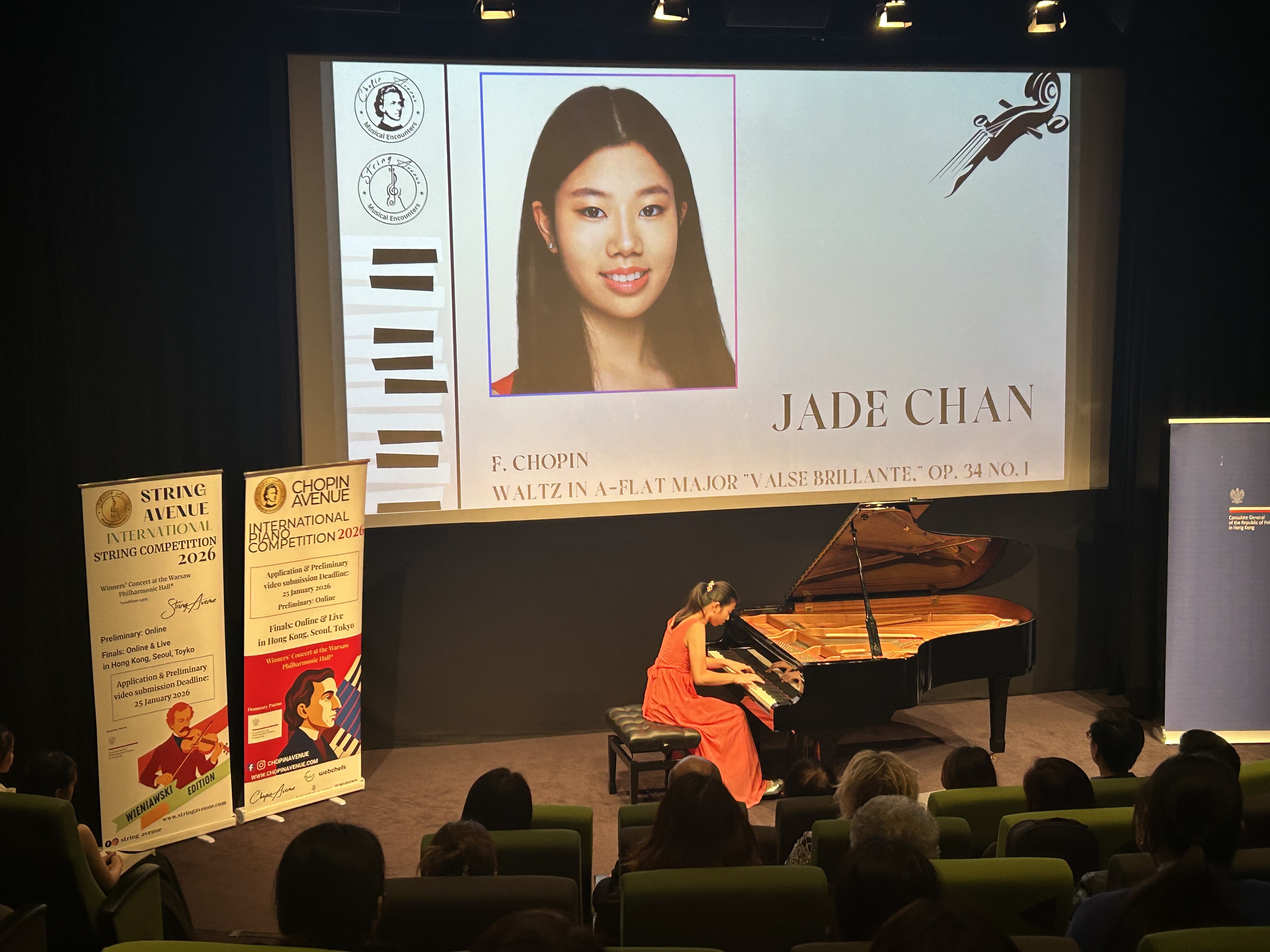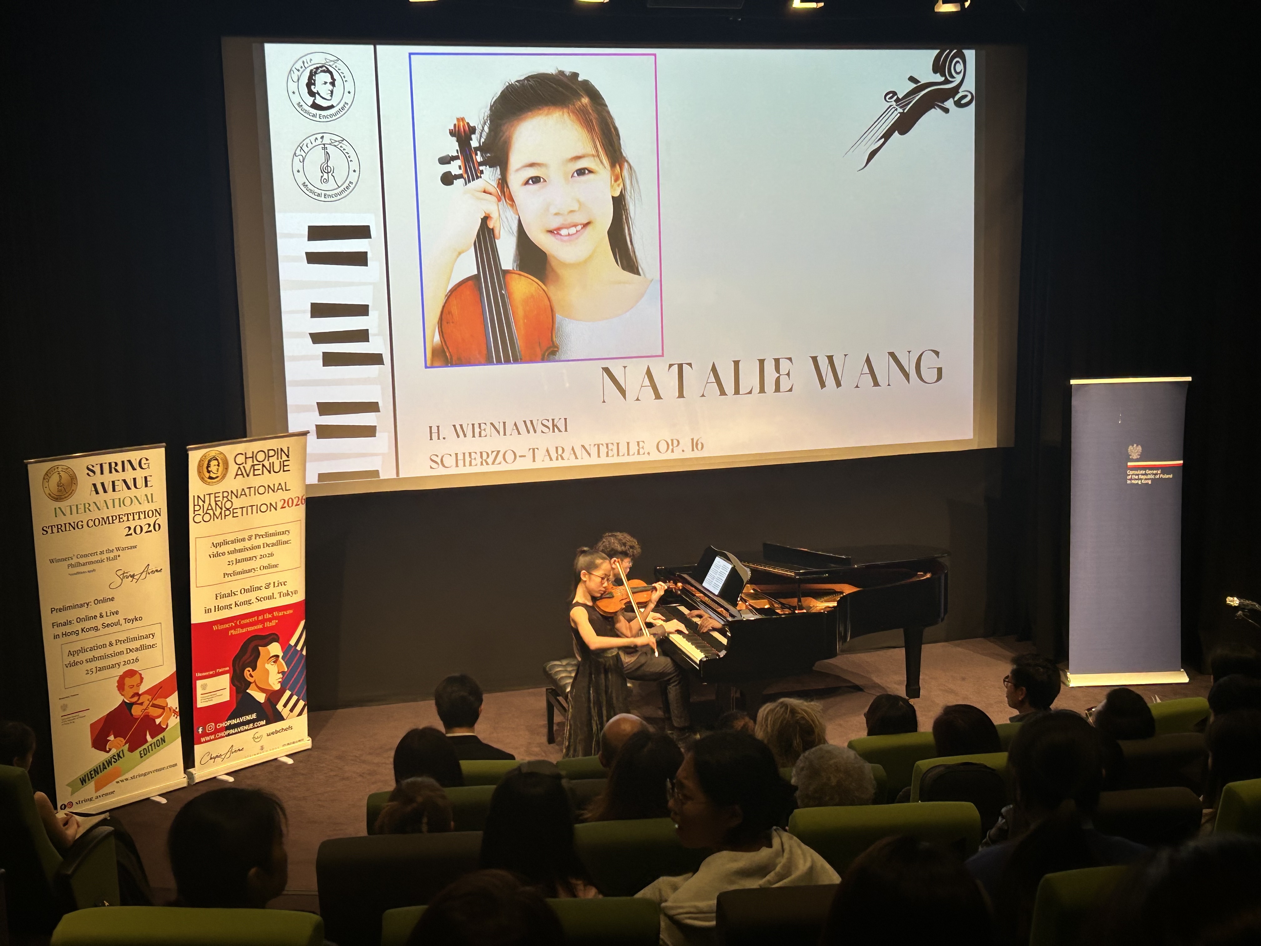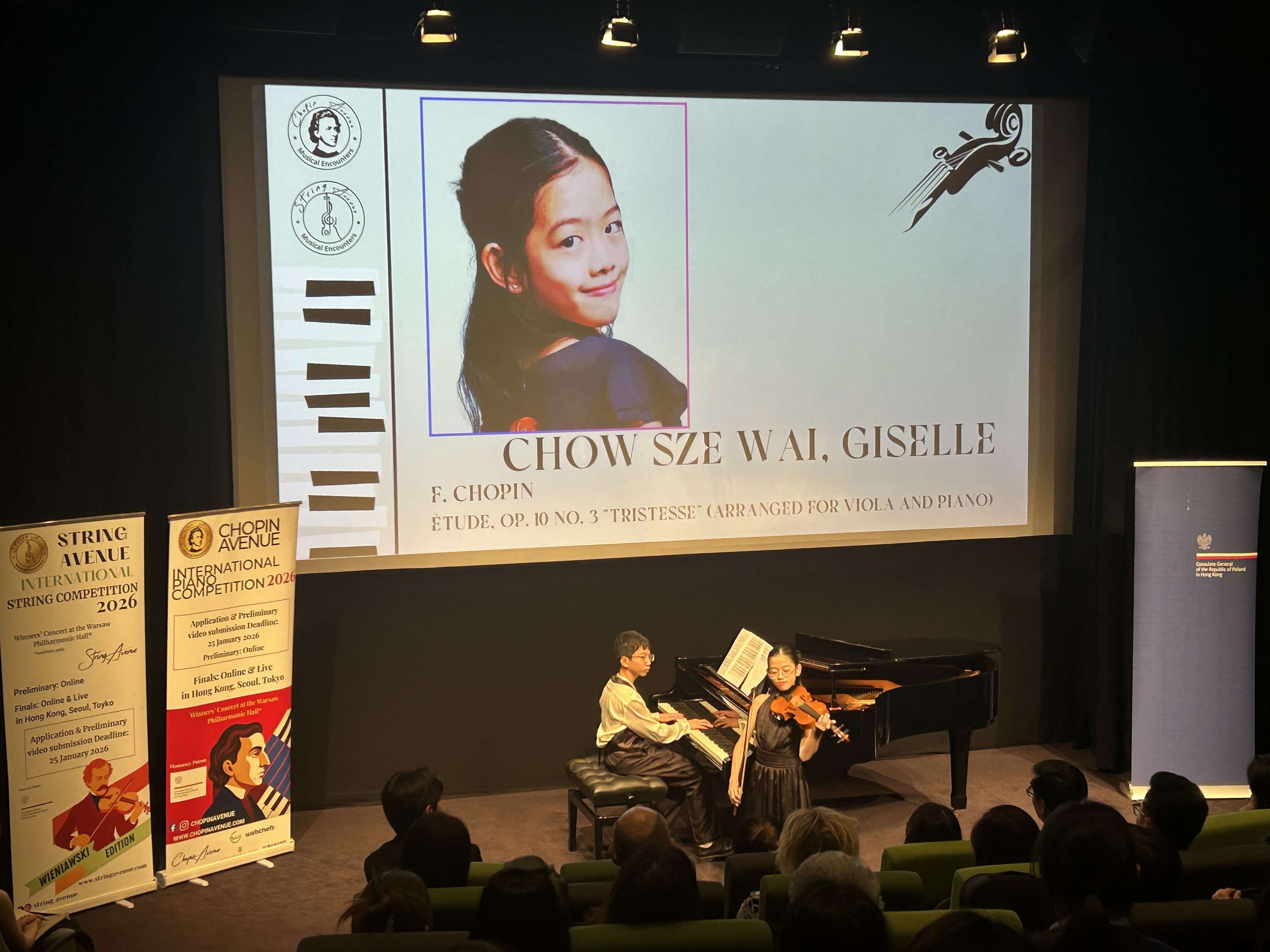 20 listopada 2025 r. w Hong Kong Arts Centre odbył się koncert fortepianowo-skrzypcowy „Chopin Avenue and String Avenue - Wieniawski Edition” w którym wystąpili młodzi muzycy z Hongkongu i Korei Południowej. Współorganizatorem i sponsorem koncertu był Konsulat Generalny RP w Hongkongu.