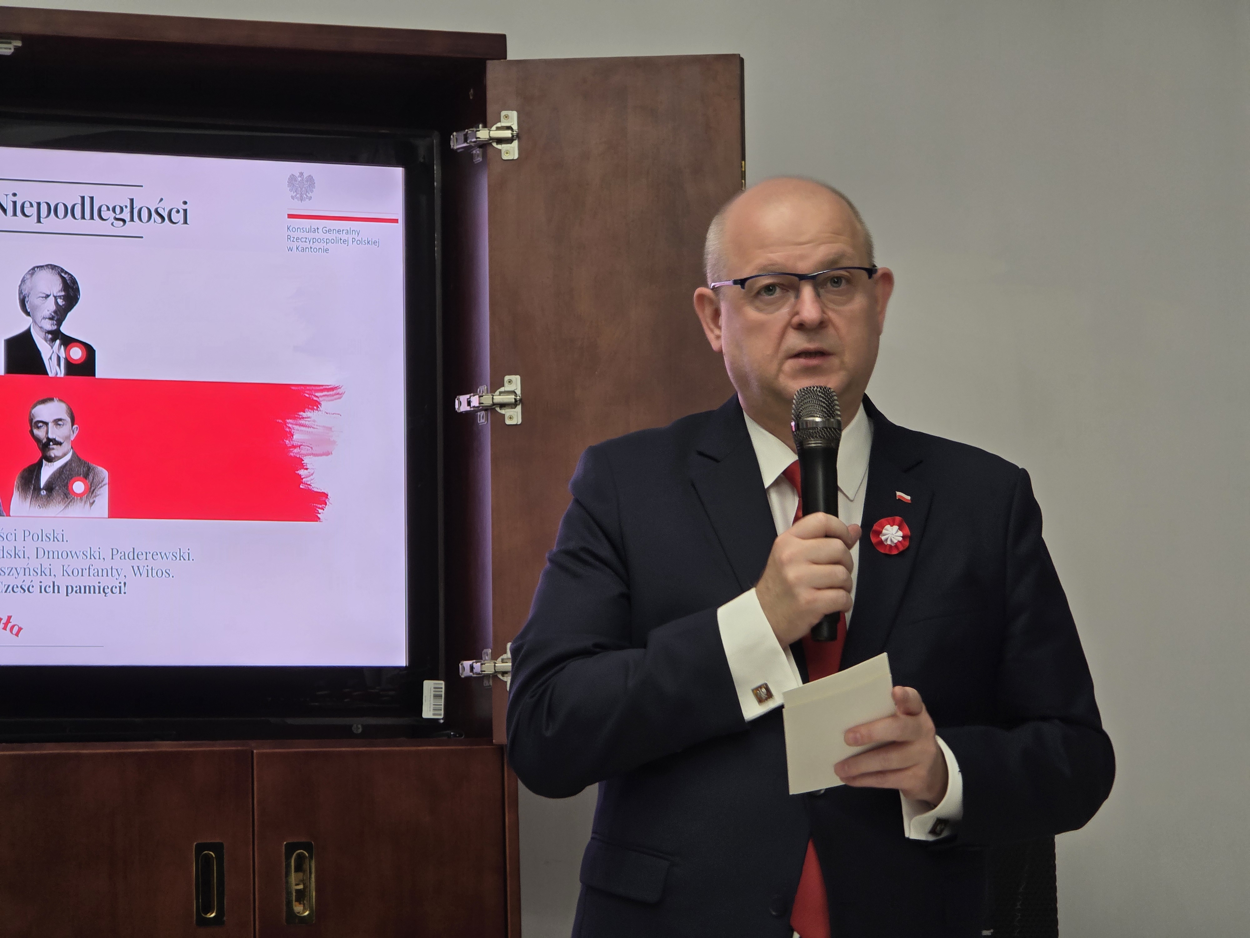 W spotkaniu zorganizowanym 15 listopada 2025 r. w Konsulacie Generalnym RP w Kantonie z okazji 107. rocznicy odzyskania przez Polskę niepodległości udział wzięli przedstawiciele lokalnej Polonii wraz z rodzinami, absolwenci studiów polonistycznych, a także zagraniczni goście związani z Polską.