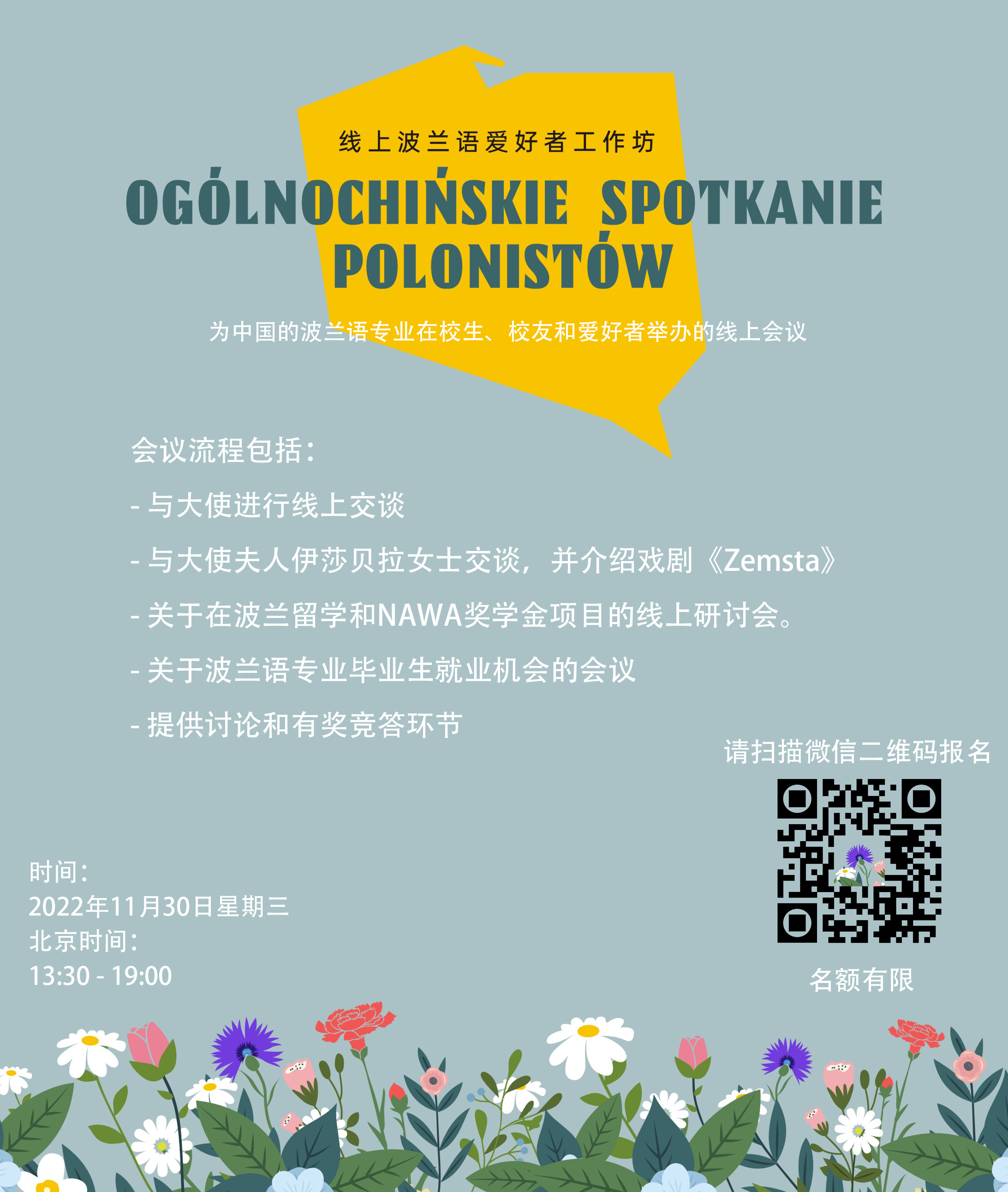 W środę 30 listopada 2022 r. Ambasada RP w Pekinie zorganizowała spotkanie online skierowane do studentów, absolwentów polonistyk oraz wszystkich innych miłośników Polski i języka polskiego w Chinach - pierwsze „Ogólnochińskie spotkanie polonistów (online)”.
