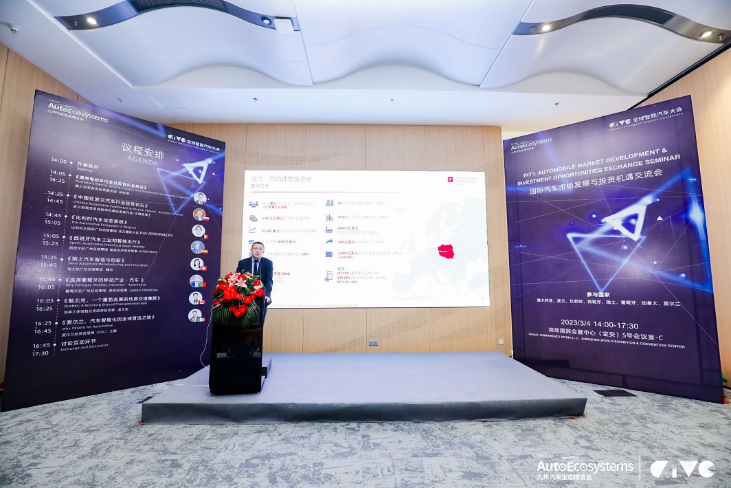 Przedstawiciele Konsulatu Generalnego RP w Kantonie i Zagranicznego Biura Handlowego Polskiej Agencji Inwestycji i Handlu S.A. w Szanghaju (ZBH) uczestniczyli w międzynarodowym forum inwestycyjnym w Shenzhen. Forum inwestycyjne International Automobile Market Development and Investment Opportunities Exchange Seminar, którego pomysłodawcą był Konsulat Generalny RP w Kantonie, odbyło się 4 marca 2023 r. w ramach targów motoryzacyjnych AutoEcosystems 2023. Jednym z głównych elementów programu forum była prezentacja wygłoszona przez Andrzeja Juchniewicza, Kierownika ZBH, dotycząca uwarunkowań rynkowych oraz możliwości inwestycyjnych w przemyśle motoryzacyjnym w Polsce, ze szczególnym uwzględnieniem sektora elektromobilności. Podczas forum, obok Polski swoje prezentacje wygłosili przedstawiciele Australii, Belgii, Hiszpanii, Szwajcarii, Portugalii, Kanady oraz Irlandii. Forum zgromadziło ok. 60 przedstawicieli chińskiego przemysłu motoryzacyjnego i mediów. Podczas wydarzenia dystrybuowane były materiały dotyczące Polski i polskiego przemysłu motoryzacyjnego.