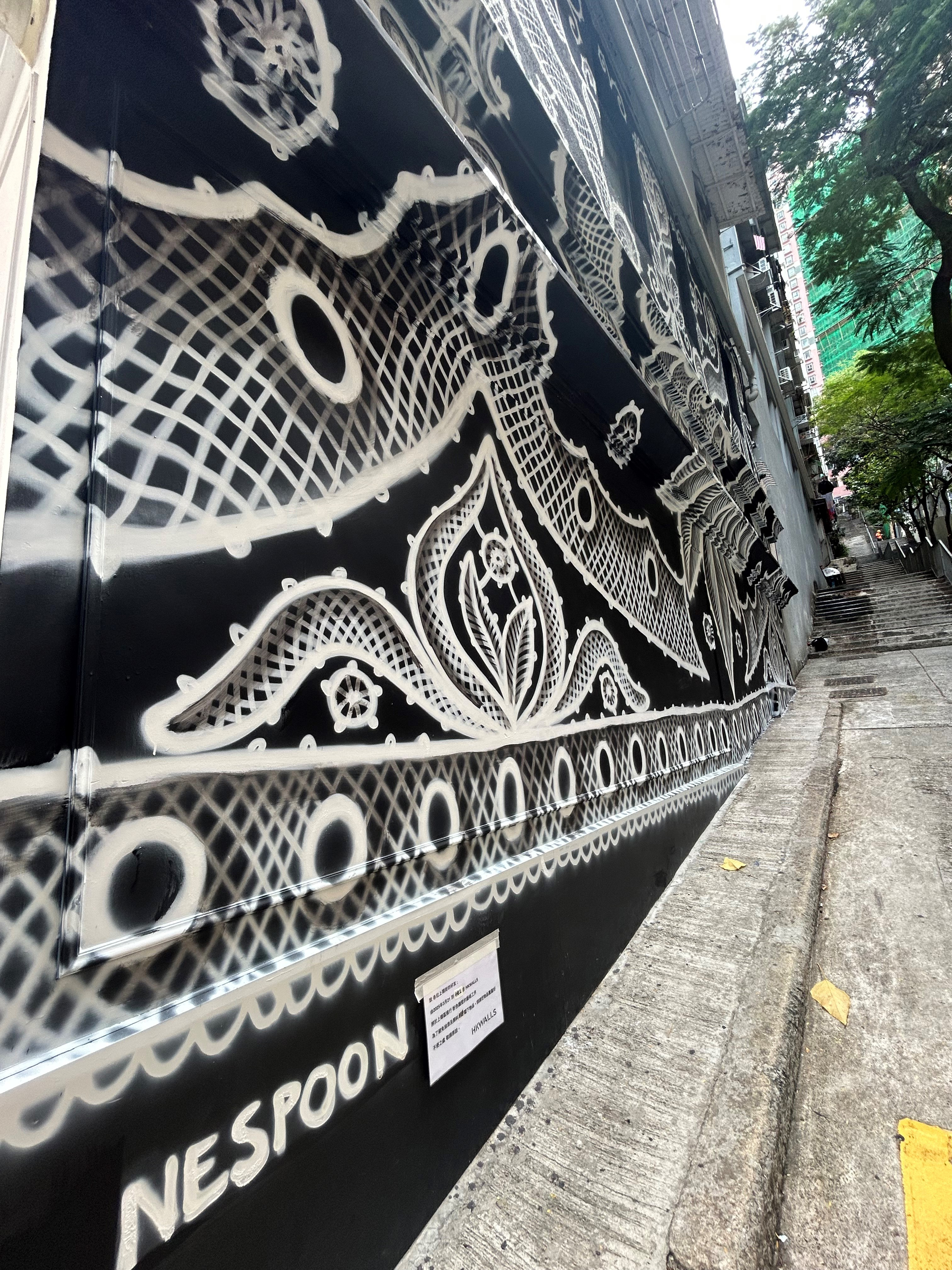 NeSpoon - artystka znana z unikalnych muralowych koronek - stworzyła mural przy ulicy Po Hing Fong w dzielnicy Sheung Wan, w samym sercu Hongkongu. To jej kolejna znakomita realizacja wśród tych, które już zdobią ściany na całym świecie. Prace Nespoon stanowią przykład wysokiej jakości polskiej sztuki ulicznej. Artystka ma na swoim koncie liczne projekty zrealizowane w takich krajach jak Francja, Włochy, Australia, Irlandia, Portugalia, Nowa Zelandia czy Indie. W Polsce jej dzieła można podziwiać m.in. w Galerii Koronki Klockowej w Bobowej oraz w Muzeum Koronki w Koniakowie, gdzie ozdobiła ścianę z okazji 103. urodzin koniakowskich koronek. W trakcie festiwalu HKWALLS prace NeSpoon były również prezentowane na wystawie HK ROOMS w centrum designu PMQ oraz na ekranach LED-owych w różnych lokalizacjach miasta. Tuż po odsłonięciu jej muralu, sukcesu artystce pogratulowali Ambasador RP Jakub Kumoch oraz Konsul Generalny Michał Kołodziejski. Przez najbliższe lata praca NeSpoon będzie stanowiła żywą promocję polskiej kultury i sztuki w Hongkongu.