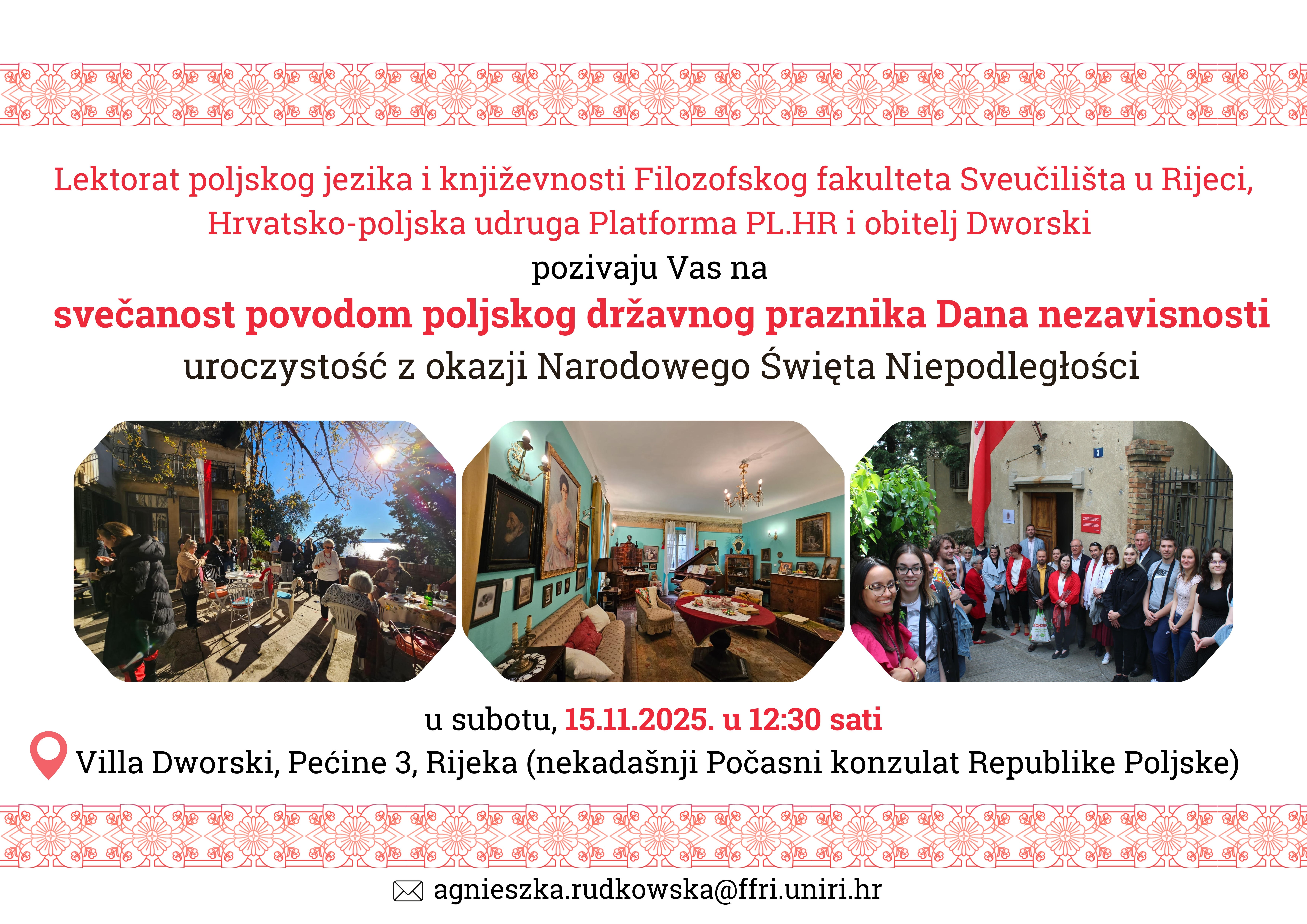W imieniu organizatorów, serdecznie zapraszamy na uroczyste obchody Dnia Niepodległości, które odbędą się w Rijece, w Willi Dworski (Rijeka, ul. Pećine 3) - budynku, w którym w okresie międzywojennym mieścił się Konsulat RP.