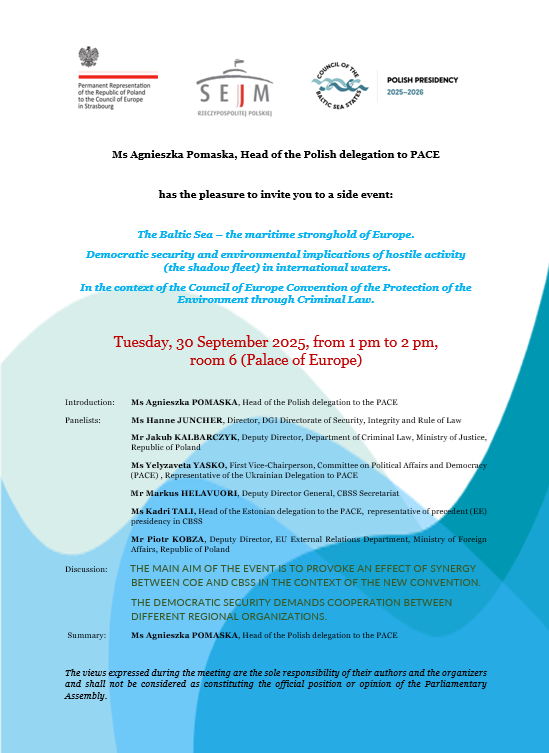 On 30 September, the Council of Europe held a debate entitled "The Baltic Sea - Europe's stronghold". Democratic security and environmental consequences of shadow fleet activity in international waters. In the context of the Convention on the Protection of the Environment through Criminal Law”. The event was co-organised by the Permanent Representation of the Republic of Poland to the Council of Europe in Strasbourg and the Sejm of the Republic of Poland.