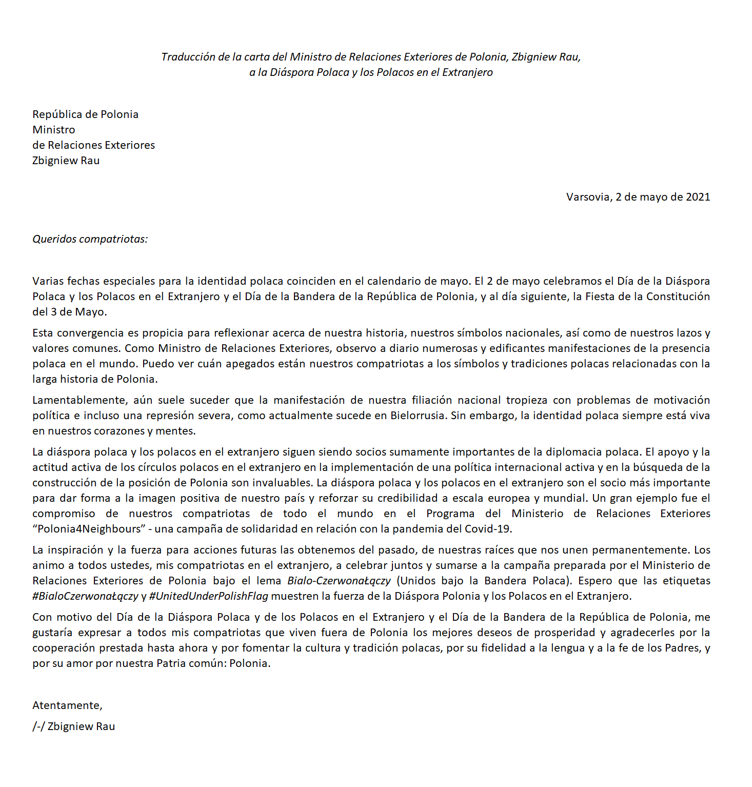 En este día tan especial, expresamos nuestro más profundo agradecimiento a la Diáspora Polaca y a los Polacos en el Extranjero por su asociación en la implementación de la política exterior del país y en la promoción de los intereses polacos en el mundo. En este día, nos gustaría agradecerles de manera especial por construir una opinión positiva sobre los polacos, por ser embajadores de lo polaco, por cultivar la lengua patria y nuestros valores, y por crear con ello un multiculturalismo mundial.