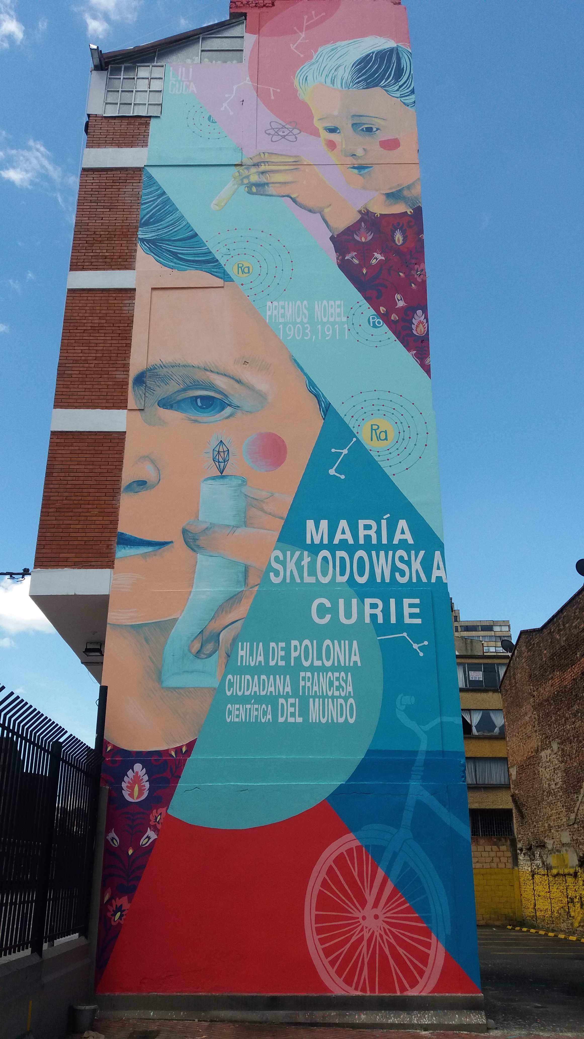 Por iniciativa de la Embajada de Polonia, la reconocida artista colombiana Lili Cuca pintó un gran retrato doble de la científica polaca María Skłodowska Curie en la pared norte del edificio situado frente a la estación Universidades de Transmilenio. Con cara al parqueadero de la Universidad Jorge Tadeo Lozano de la carrera 3a con calle 22, el mural a gran escala presenta a la científica como doble Premio Nobel de física y química, con la inscripcíon: “María Skłodowska Curie, hija de Polonia, ciudadana francesa, científica del mundo”. Con el propósito de enfatizar el origen polaco de Skłodowska-Curie, la científica fue retratada con un vestido que lleva un patrón de los tradicionales recortes de papel del folclore de la región de Łowicz. Tampoco pudo faltar la figura de su modo de transporte preferido (la bicicleta), que adicionalmente es un guiño a la cultura urbana de Bogotá. Esperamos que pronto puedan ver el mural directamente!