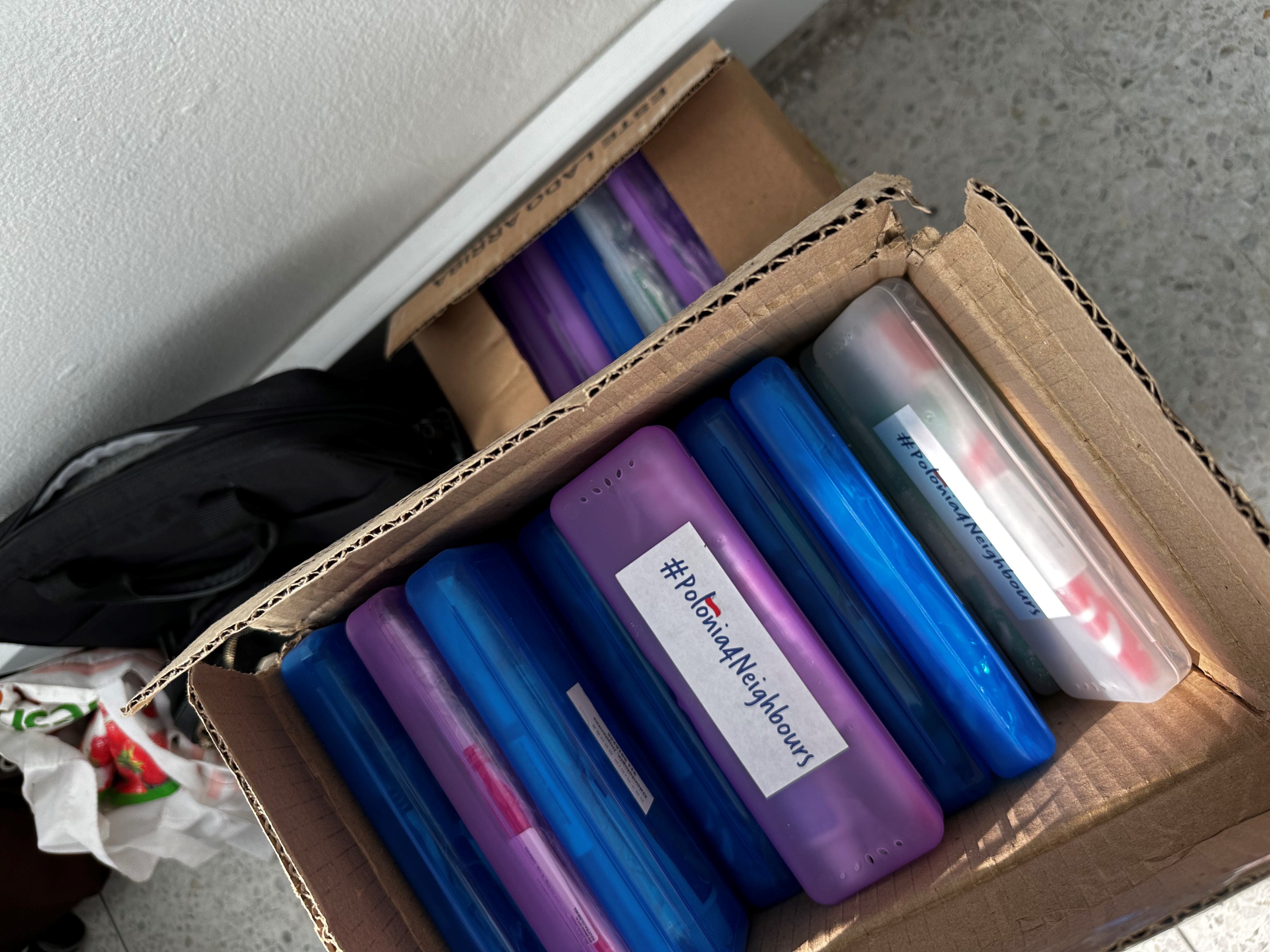 Gracias a la financiación recibida por el Departamento de Cooperación con las Comunidades Polacas y los Polacos en el Extranjero del Ministerio de Asuntos Exteriores en el marco del proyecto #Polonia4Neighbours para el año 2023, se adquirieron kits para mujeres embarazadas y kits de higiene general, compuestos, entre otros, por. entre otros, toallas higiénicas, protectores de lactancia o pezoneras reutilizables, jabón, champú, desodorante, pañales, pañitos húmedos, crema anti pañalitis, mascarillas reutilizables, papel higiénico, gel antibacterial y una pequeña manta.