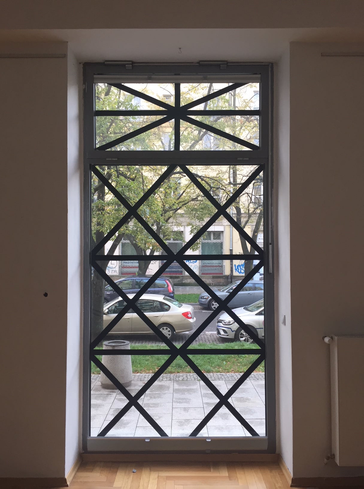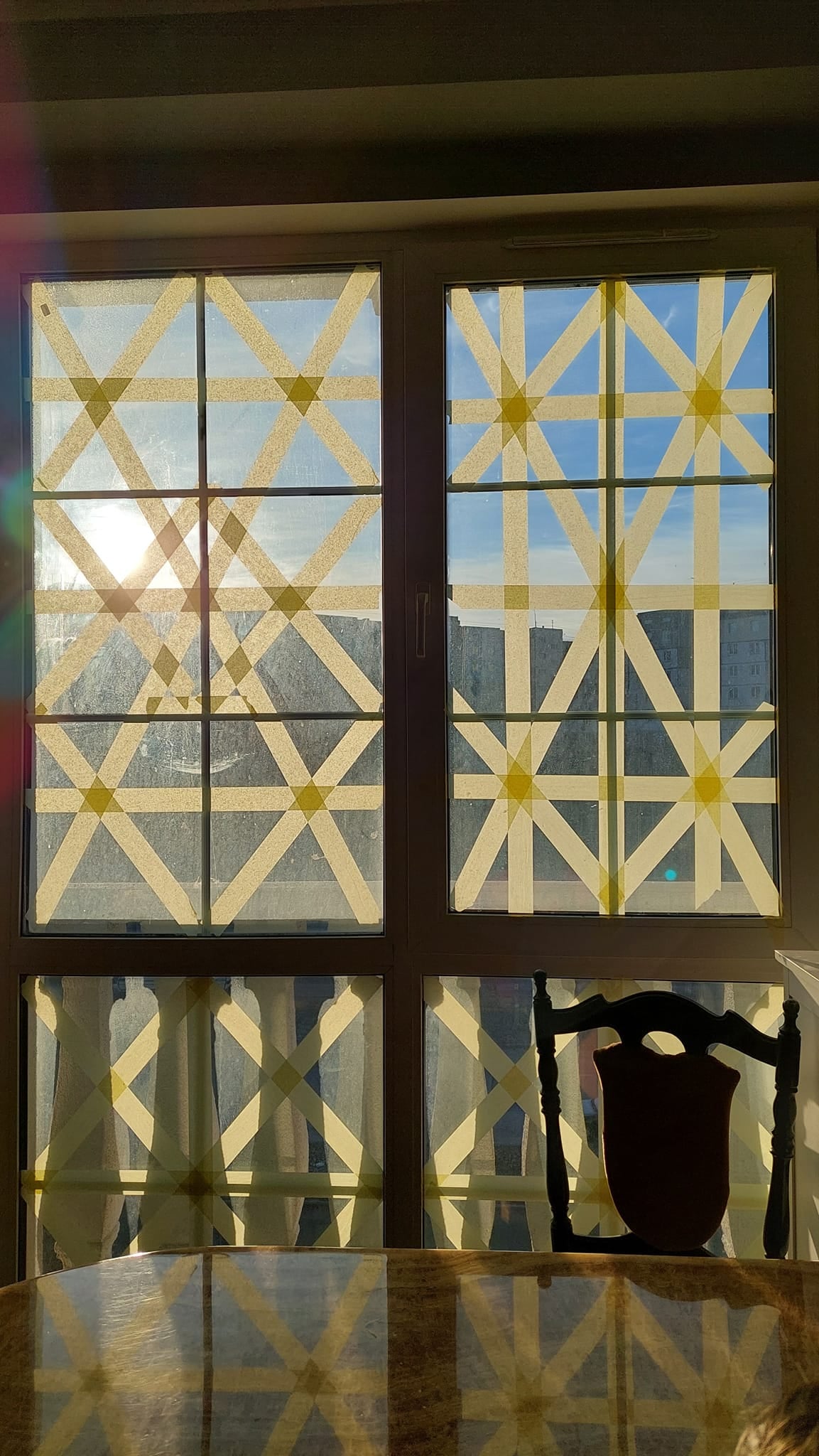 La cinta adhesiva pegada en las ventanas es un símbolo elocuente de la guerra, que replica la acción de los habitantes de las ciudades ucranianas, que se ven obligados a pegar cinta adhesiva sobre los vidrios de sus ventanas para evitar que estos estallen durante los bombardeos rusos y caigan de forma descontrolada afectando a las personas.