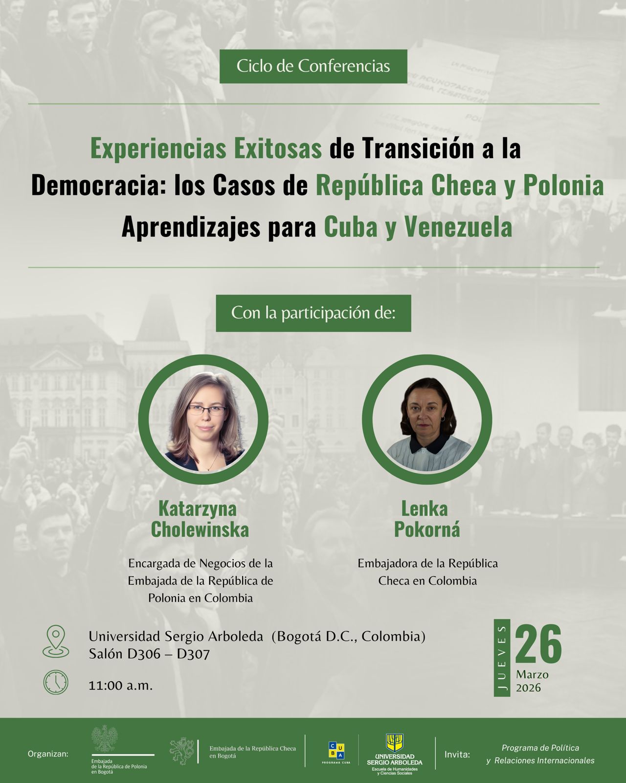 El 26 de marzo, Katarzyna Cholewińska, jefe de la Sección Político-Económica de la Embajada de Polonia en Bogotá, tuvo el gusto de visitar la Universidad Sergio Arboleda, donde, junto con Lenka Pokorna, Embajadora de la República Checa, participó en el seminario "Experiencias exitosas de transición a la democracia: los casos de República Checa y Polonia. Aprendizajes para Cuba y Venezuela”. Este fascinante evento fue organizado por el profesor Sergio Ángel, director del Programa Cuba.