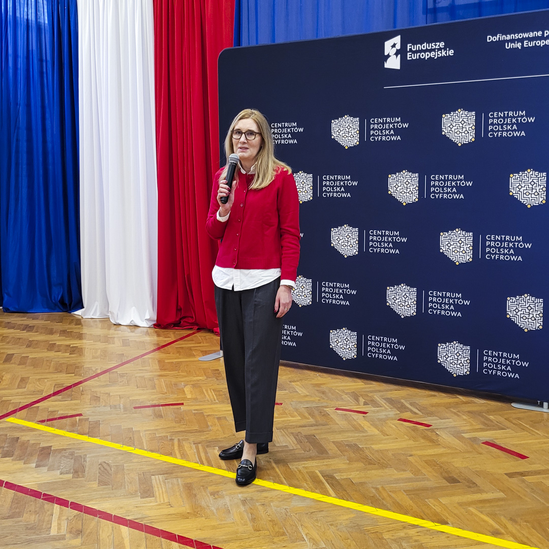 Zastępczyni Dyrektora CPPC Agnieszka Krauzowicz uroczyście otworzyła wydarzenie i powitała wszystkich uczniów. Podkreśliła, jak istotne w dzisiejszych czasach są kompetencje cyfrowe: