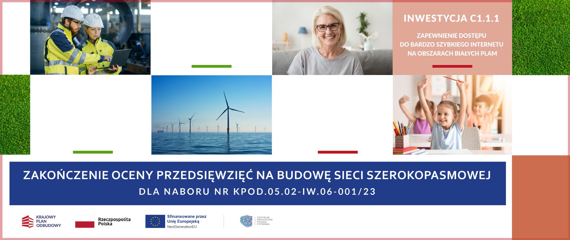 Informujemy, że jako jednostka wspierająca Krajowy Plan Odbudowy i Zwiększania Odporności, zakończyliśmy ocenę wniosków złożonych w ramach naboru nr KPOD.05.02-IW.06-001/23 ogłoszonego dla Inwestycji C1.1.1 - Zapewnienie dostępu do bardzo szybkiego internetu na obszarach białych plam.