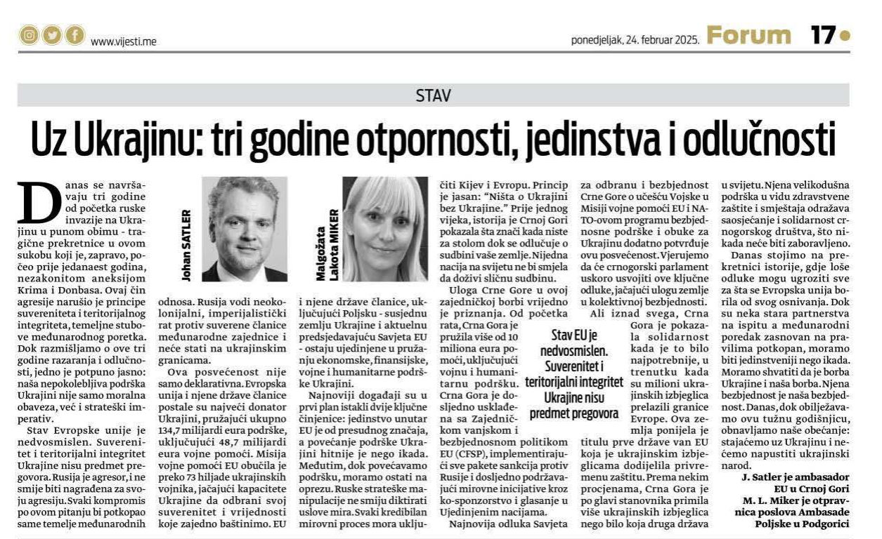 Uloga Crne Gore u ovoj zajedničkoj borbi vrijedno je priznanja. Od početka rata, Crna Gora je pružila više od 10 miliona eura pomoći, uključujući vojnu i humanitarnu podršku. Crna Gora je dosljedno usklađena sa Zajedničkom vanjskom i bezbjednosnom politikom EU (CFSP), implementirajući sve pakete sankcija protiv Rusije i dosljedno podržavajući mirovne inicijative kroz ko-sponzorstvo i glasanje u Ujedinjenim nacijama.