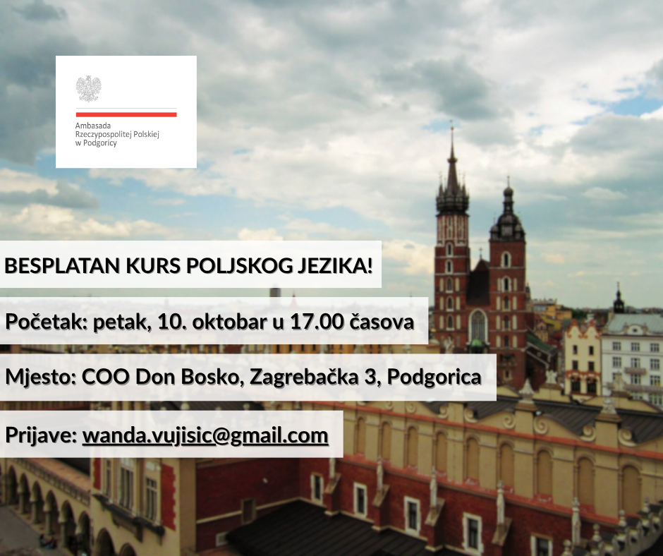 Ambasada Republike Poljske u Podgorici i Udruženje Poljaka nastanjenih u Crnoj Gori pozivaju vas na besplatan kurs poljskog jezika.