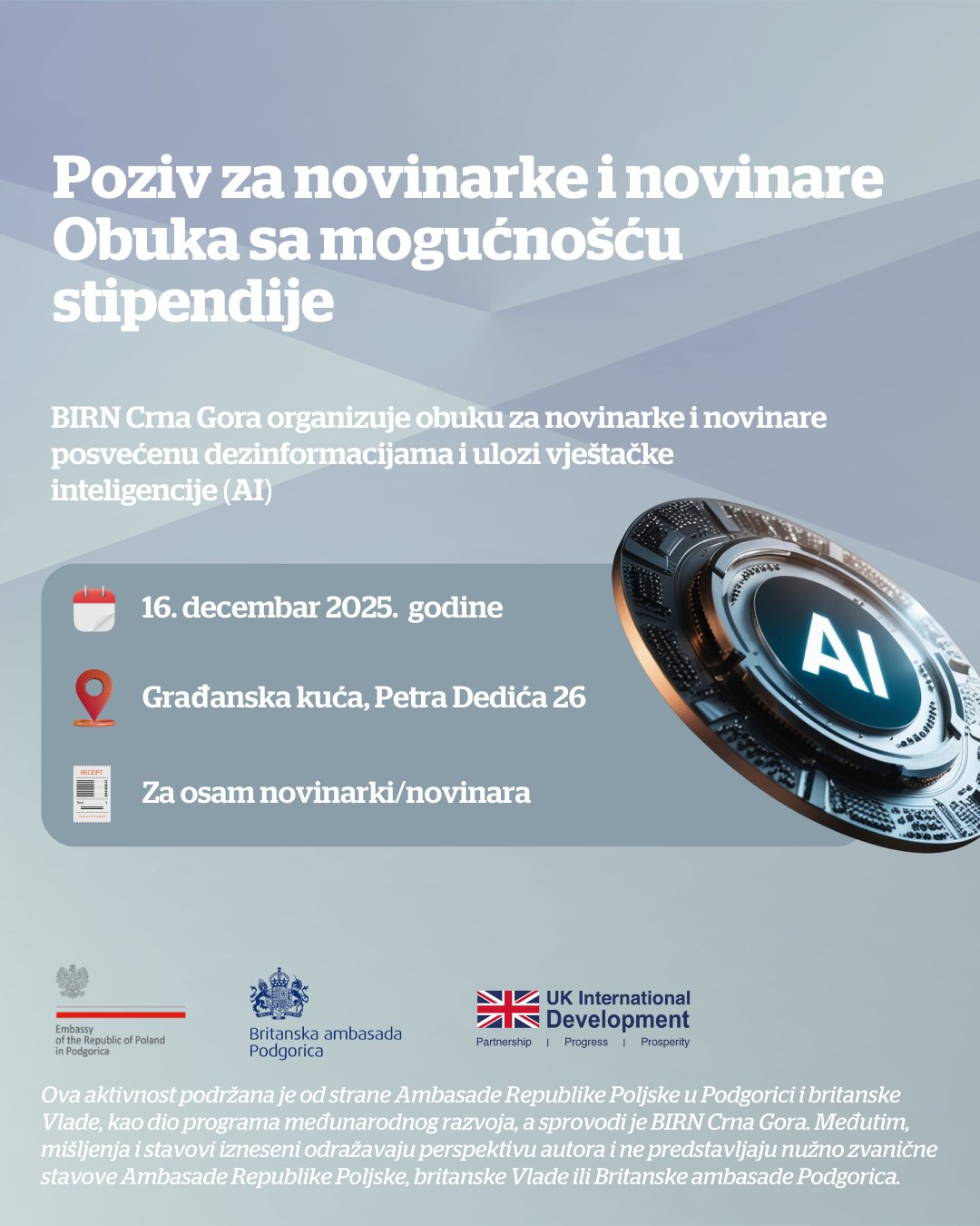Obuka će se sprovesti 16. decembra 2025. godine uz učešće eksperata iz Poljske u prostorijama BIRN Crna Gora u Podgorici (Građanska Kuća, Petra Dedića 26) i trajaće od 9.00 do 17.00 časova. Ukupan broj novinara i novinarki koji će biti odabrani za obuku je osam.