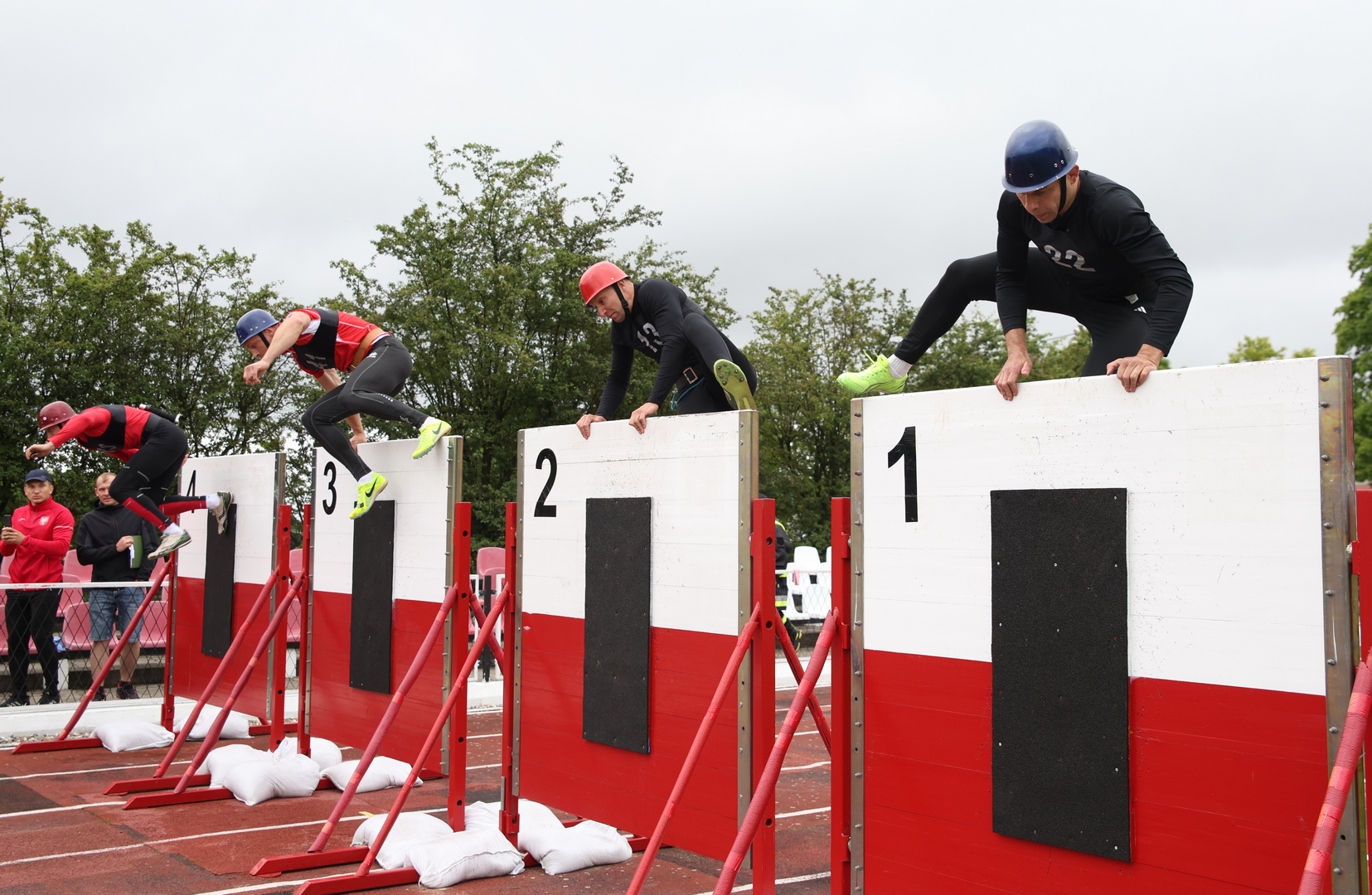 Każdy z nich przebiega 100 m. pokonując przeszkodę. I zawodnik pokonuje domek biegnąc po dachu, II zawodnik pokonuje ścianę, III przebiega przez równoważnię, łączy dwa węże w linię wężową i podłącza ją do rozdzielacza, IV zawodnik przy użyciu gaśnicy proszkowej gasi palącą się ciecz. Funkcje pałeczki pełni prądownica.