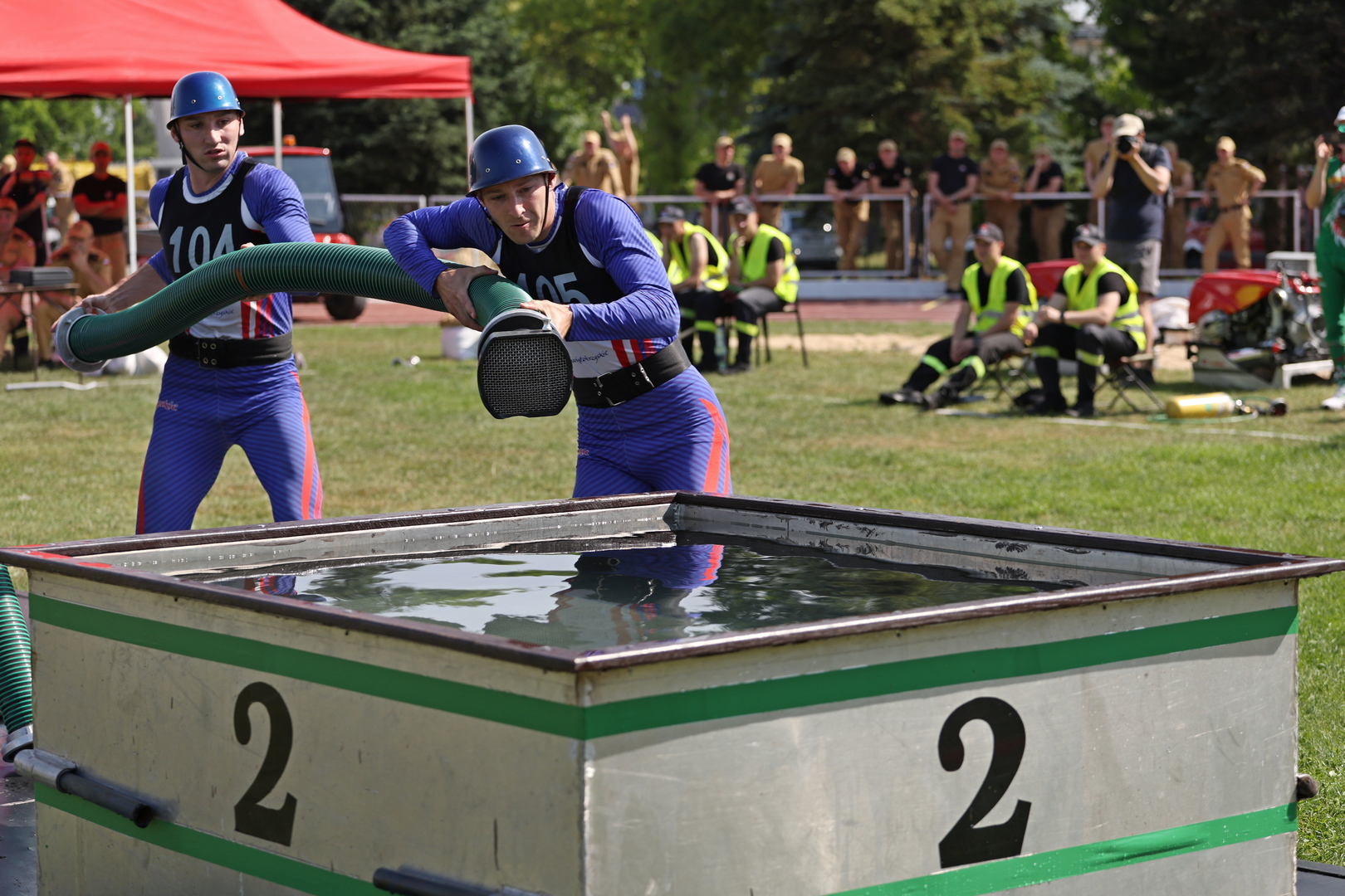 Zawodnicy mieli za zadanie zbudować linię ssawną do ustawionego obok motopompy zbiornika, linię główną i 2 linię gaśnicze. Po zajęciu stanowisk przez prądowników – napełnić 10 l zbiornik wodą podawaną przez otwory nalewowe w tarczach.
