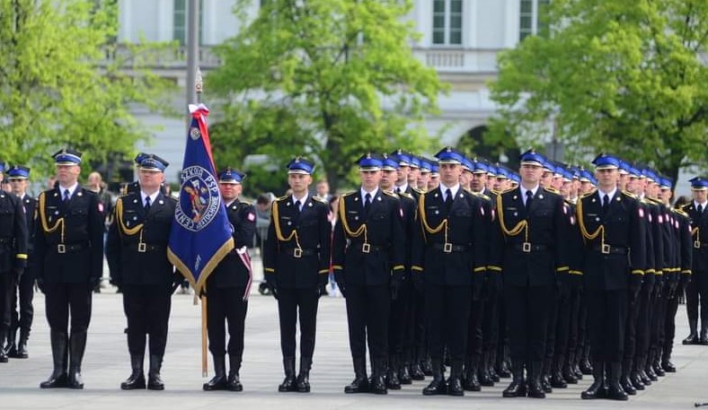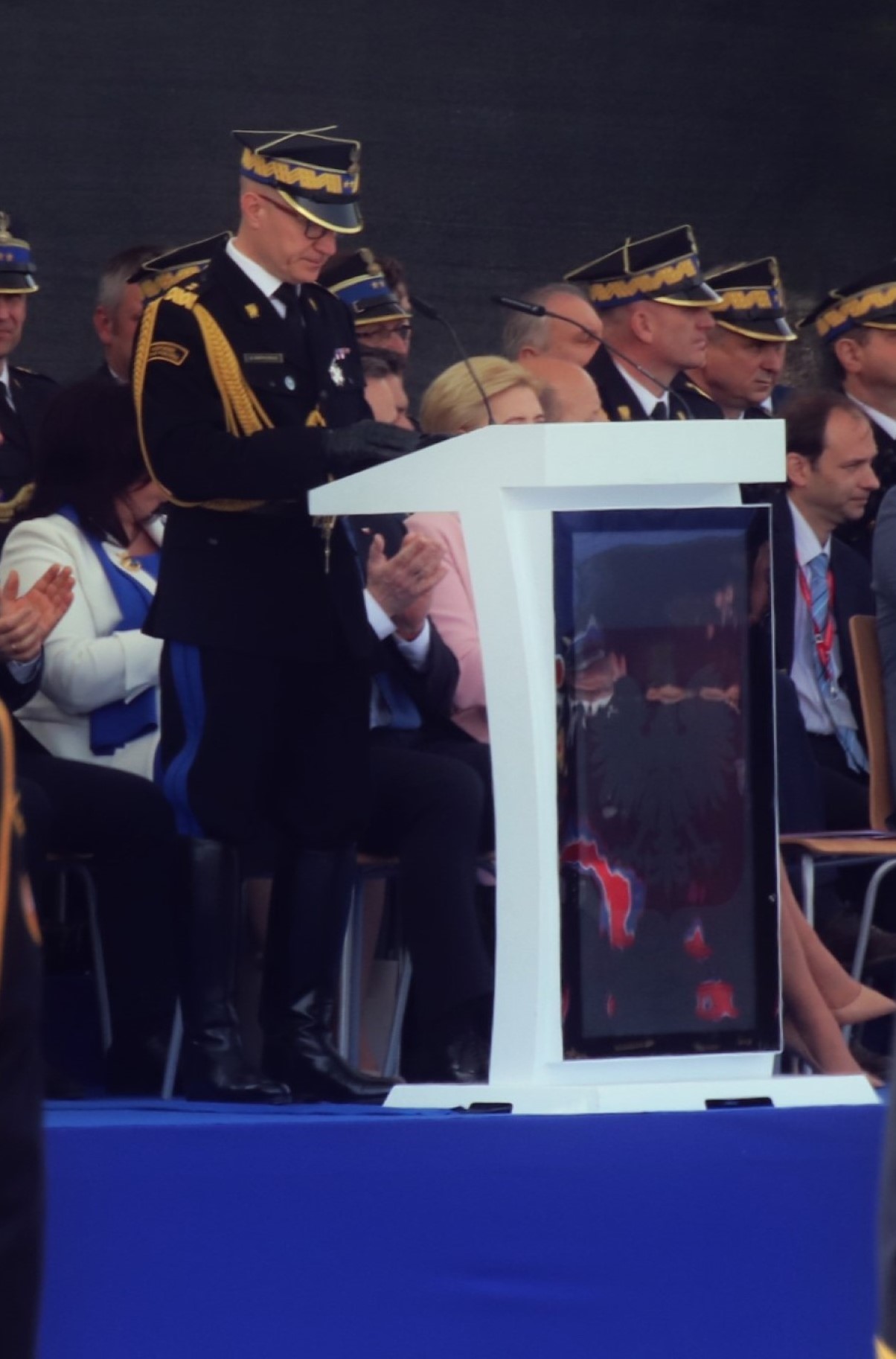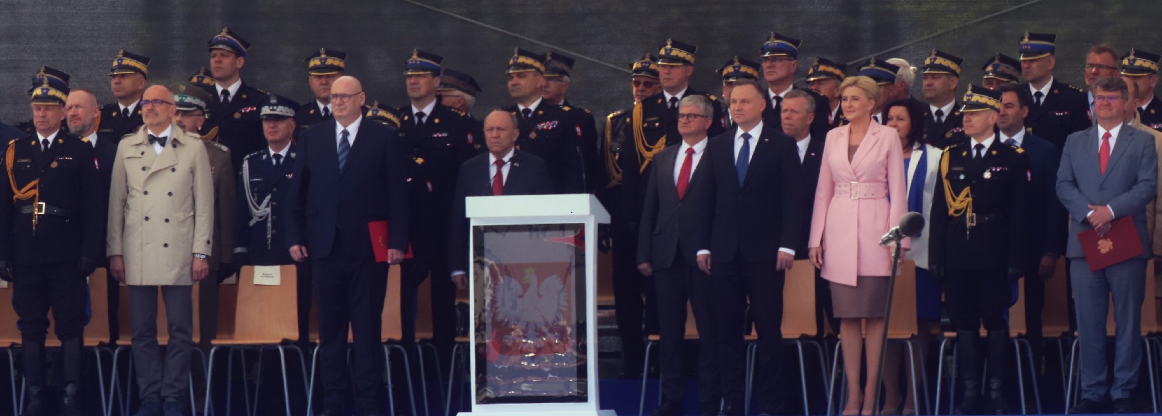 Następnie, głos zabrał Prezydent RP Andrzej Duda: "Strażacy cieszą się największym zaufaniem i szacunkiem społecznym. Dziękuję za służbę w kraju i poza granicami, gdzie tak pięknie nas reprezentowaliście niosąc pomoc."