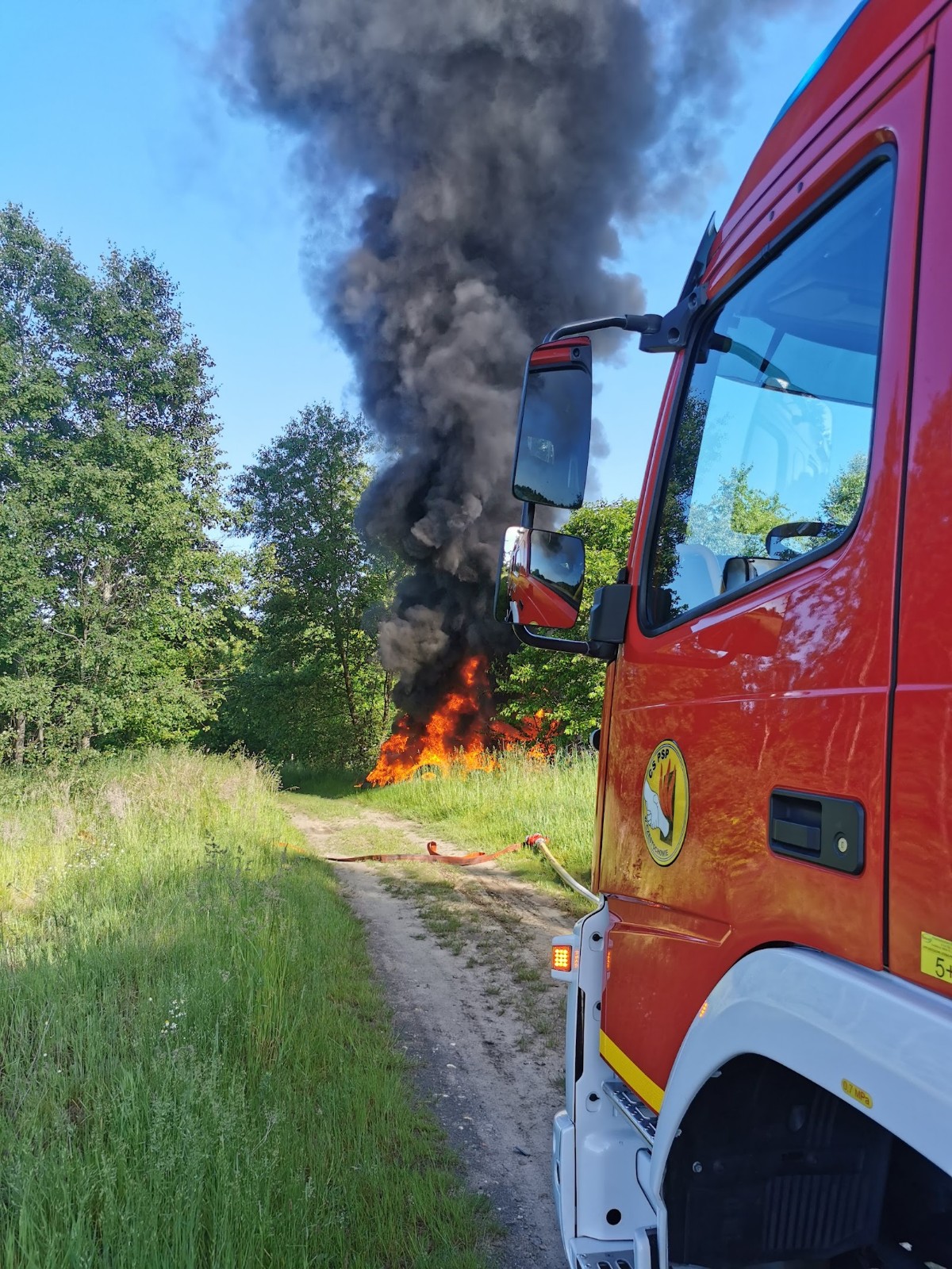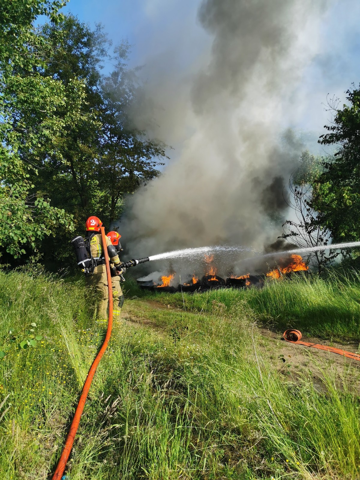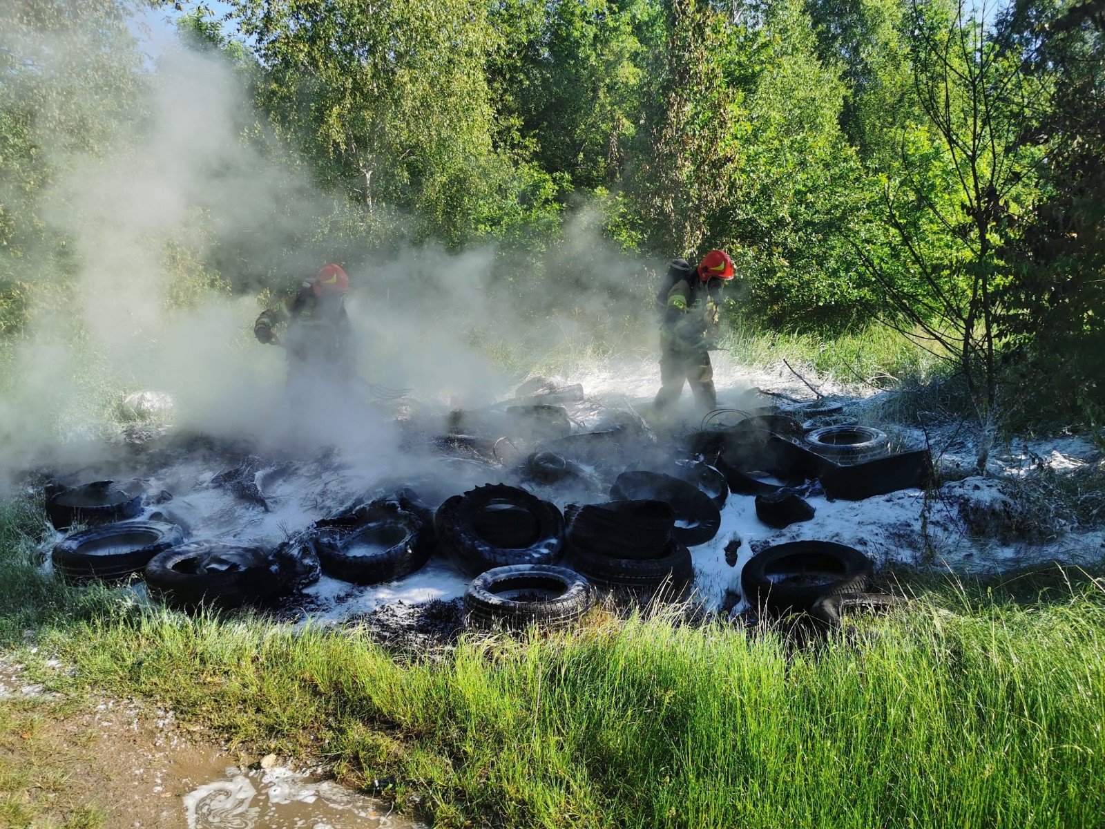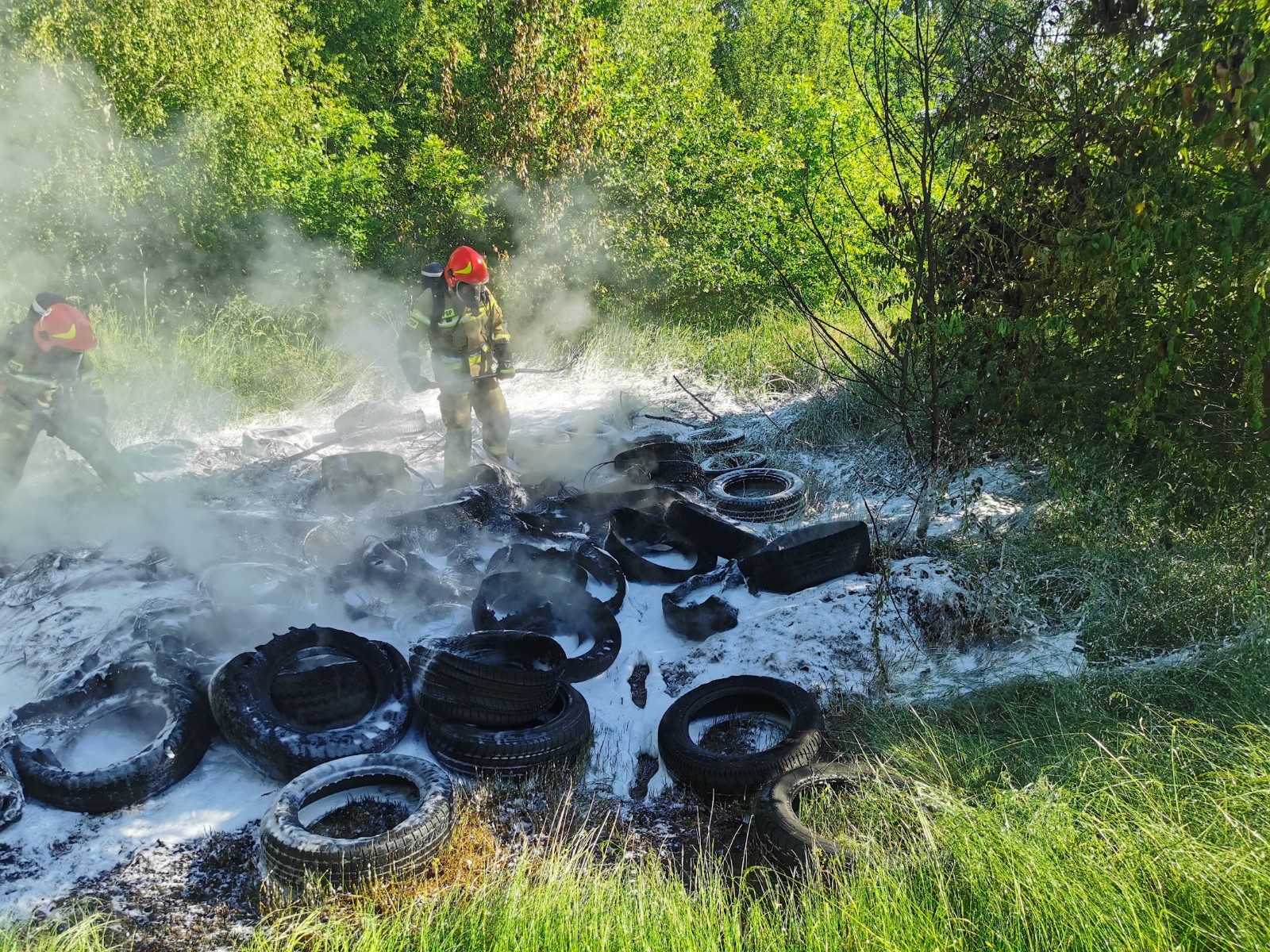 Po dojeździe na miejsce zdarzenia i przeprowadzeniu rozpoznania KDR ustalił, iż pod wskazanym adresem w lesie pali się dzikie składowisko opon o powierzchni około 40 m2.