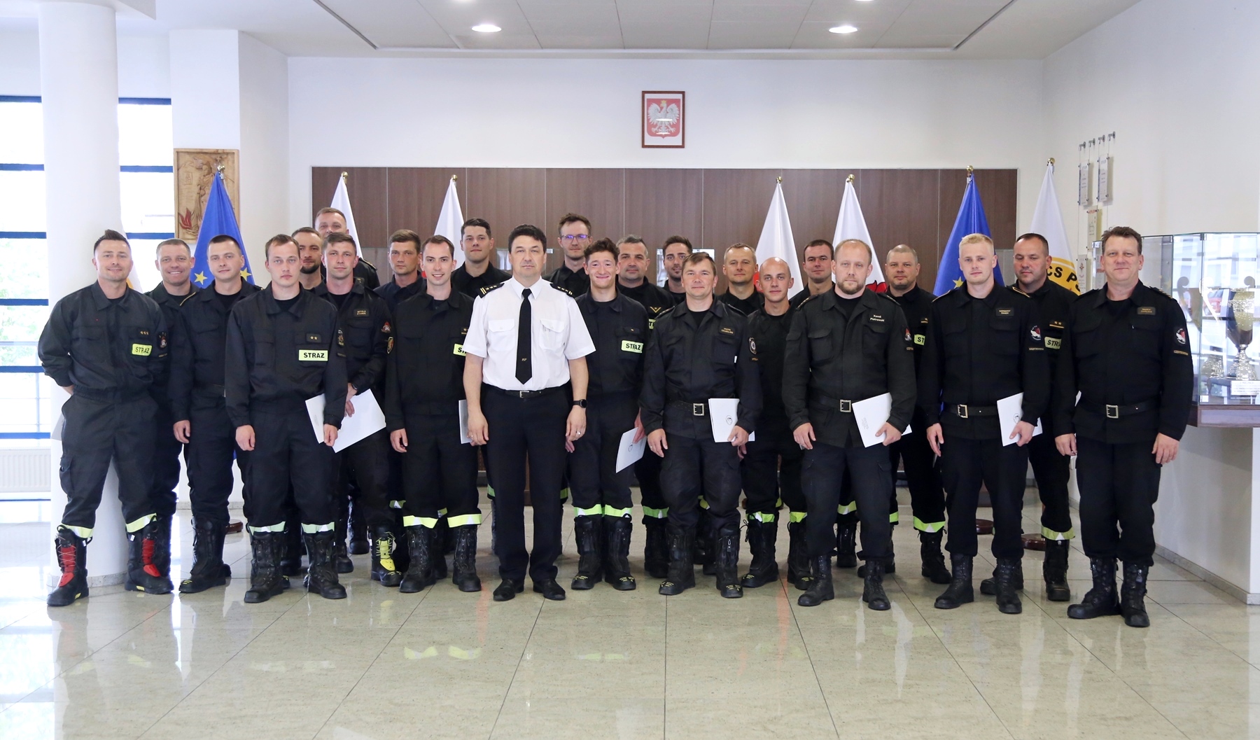 Wszyscy uczestnicy otrzymali zaświadczenia udziału w warsztatach metodyczno-tematycznych z zakresu gaszenia pożarów wewnętrznych.
