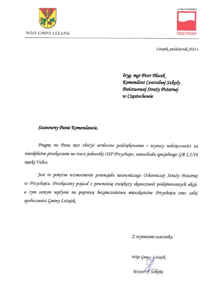 Na podstawie art. 31 ustawy z dnia 24 sierpnia 1991 r. o ochronie przeciwpożarowej oraz §33 ust.1 i §35 ust.3i §36 „Zarządzenia nr 1 Komendanta Głównego PSP z dnia 24 stycznia 2020 r. w sprawie gospodarki transportowej w jednostkach organizacyjnych PSP" w dniu 20 października 2021 roku, dokonano przekazania do Ochotniczej Straży Pożarnej w Przychojcu, samochodu specjalnego GBA 2,5/16.
