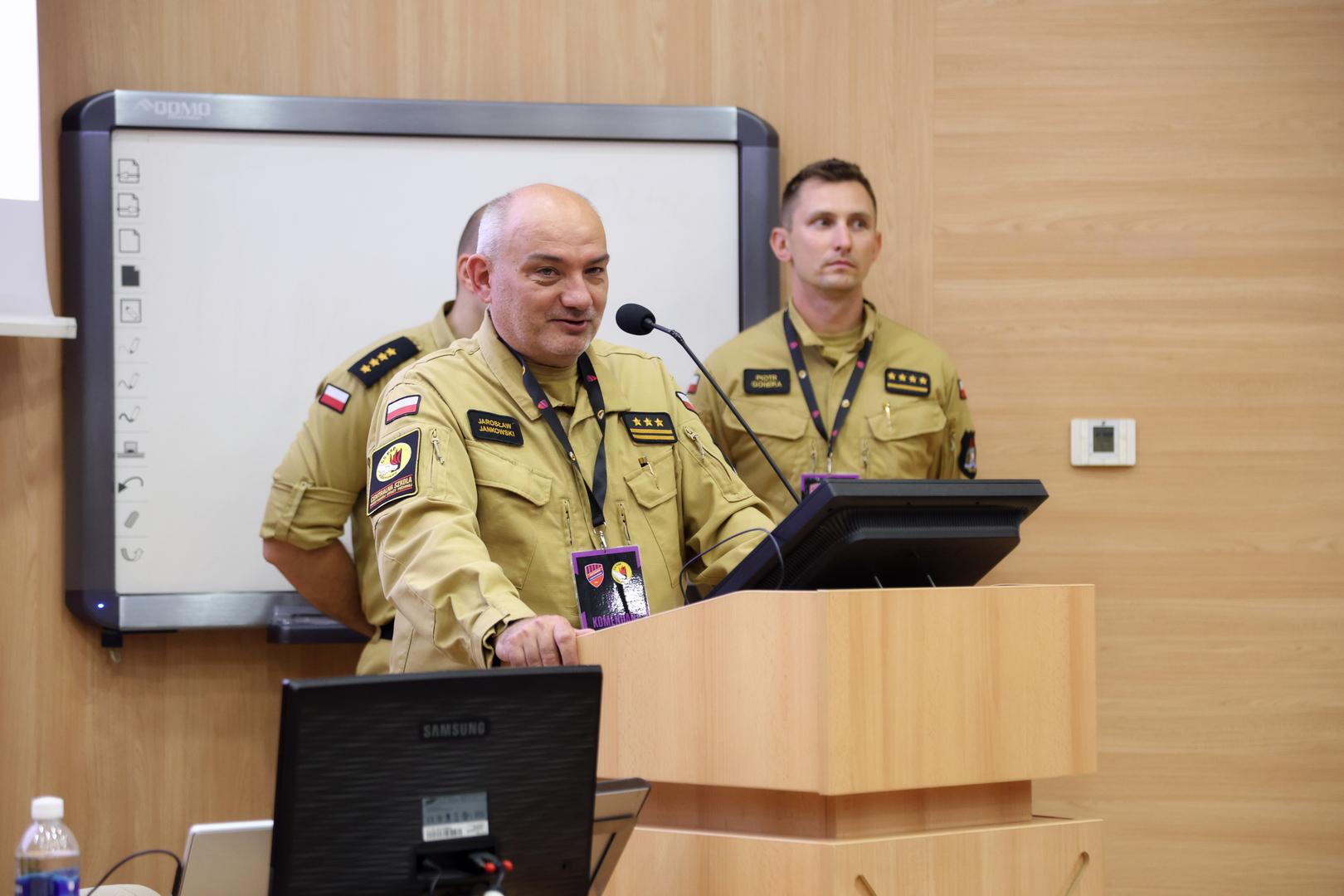 Następnie st. kpt. Piotr Gonera oraz st. kpt. Mariusz Basiak przedstawili plan realizacji poszczególnych konkurencji pożarniczo-ratowniczych przygotowanych dla zawodników - symulujących czynności wykonywane przez strażaków przy realnych akcjach.