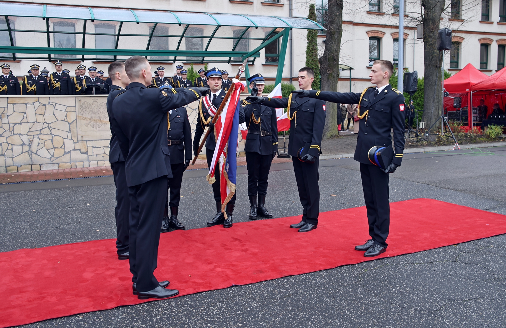 Następnie na terenie CS PSP punktualnie o godzinie 12:00 dowódca uroczystości st. bryg. Marek Grabałowski złożył meldunek Panu nadbryg. Wojciechowi Kruczkowi - Komendantowi Głównemu PSP. Po złożeniu meldunku nastąpiło podniesienie flagi państwowej na maszt. Uroczystość została zapoczątkowana przemówieniem i powitaniem zebranych gości przez Pana st. bryg. Jarosława Jankowskiego - Komendanta Centralnej Szkoły PSP w Częstochowie.