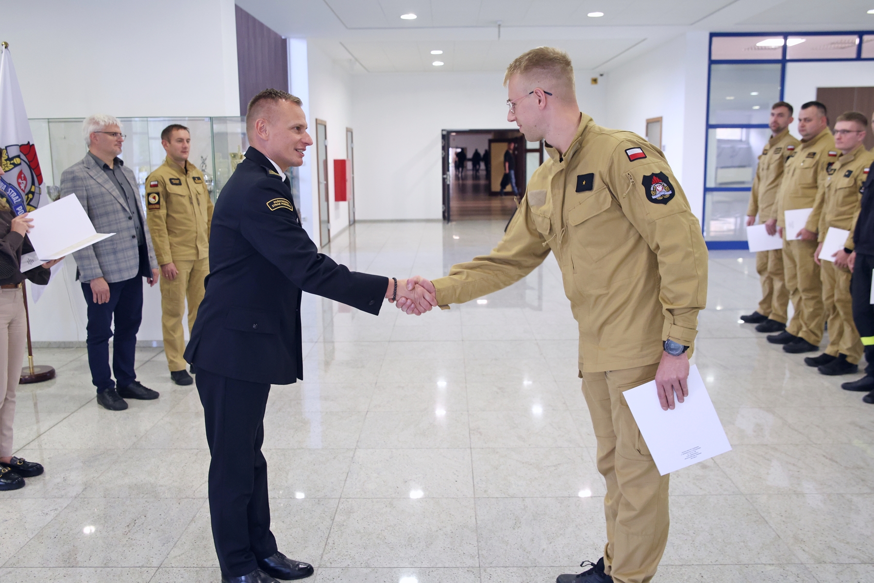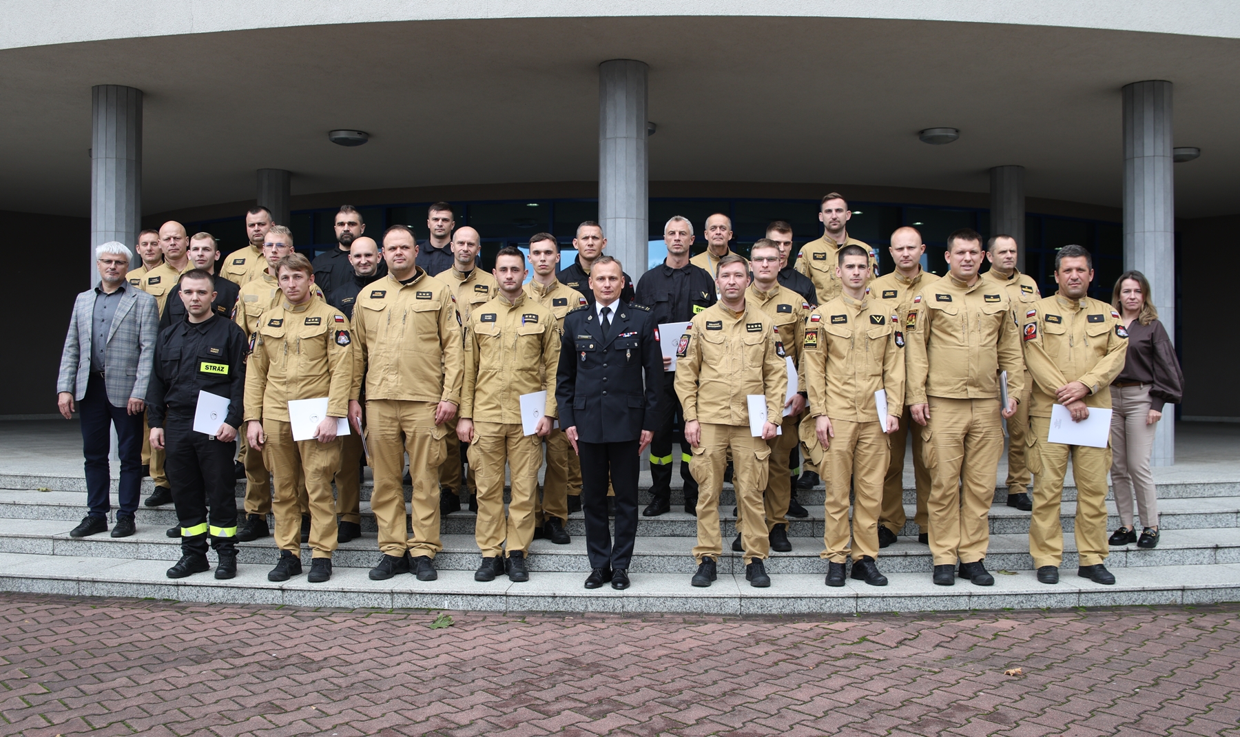 Zaświadczenia potwierdzające ukończenie szkolenia wręczył uczestnikom Zastępca Komendanta Centralnej Szkoły PSP, st. bryg. dr Damian Hajdas, w obecności Naczelnika Wydziału Szkoleń Specjalistycznych i Współpracy Międzynarodowej, st. bryg. Bogumiła Zalewskiego, oraz jego Zastępcy, mł. bryg. Arkadiusza Omazdy.