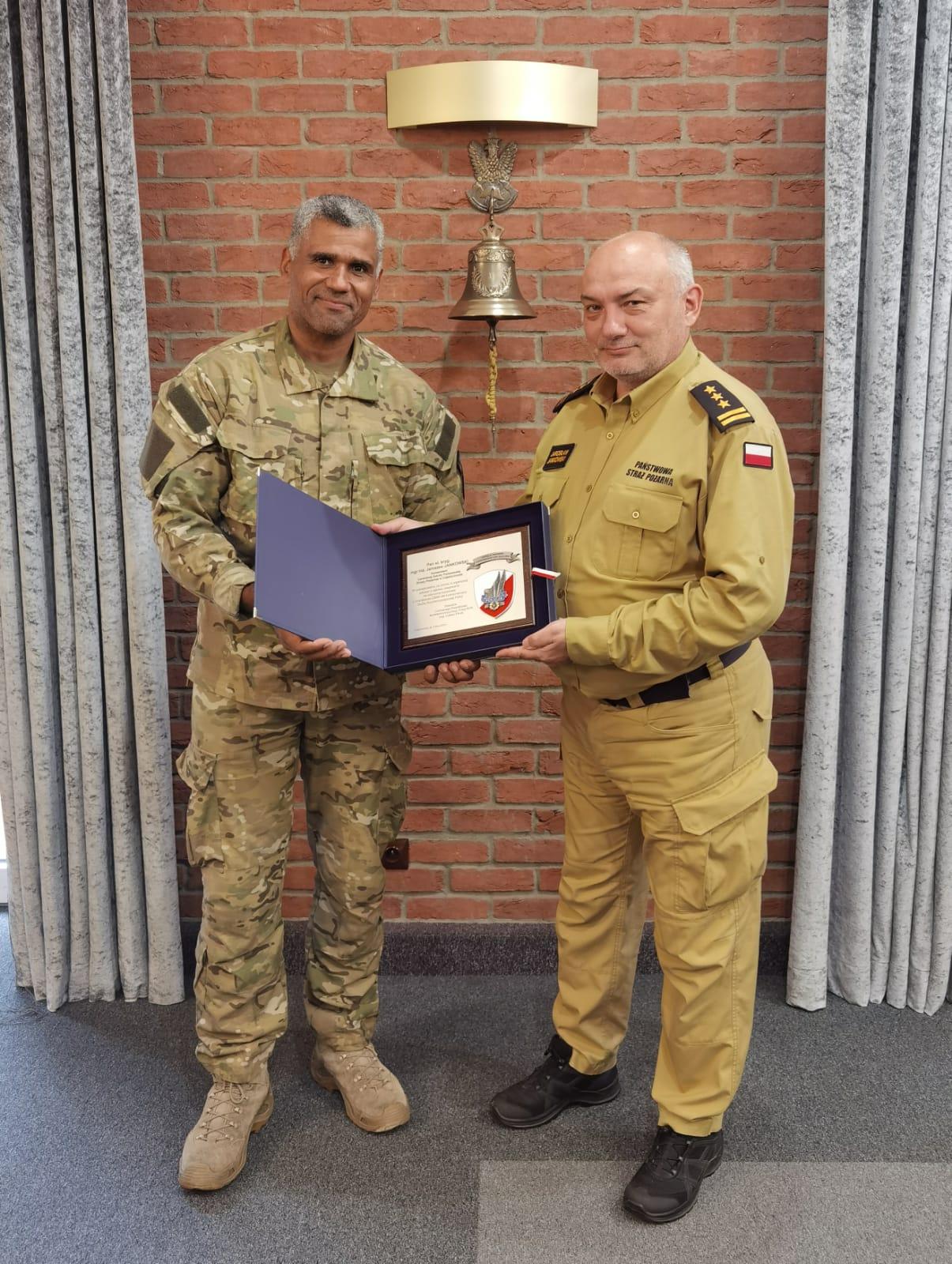 St. bryg. mgr inż. Jaroslaw Jankowski - Komendant Centralnej Szkoły Państwowej Straży Pożarnej w Częstochowie otrzymał pamiątkowy ryngraf, na znak wzorowej współpracy między służbami.