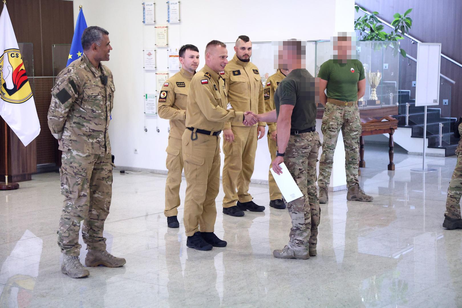 Szkolenie zakończyło się wręczeniem uczestnikom zaświadczeń przez st. bryg. dr. inż. Damiana Hajdasa - Zastępcy Komendanta Centralnej Szkoły Państwowej Straży Pożarnej w Częstochowie oraz insp. Krzysztofa Sowińskiego - Zastępcy Dowódcy Centralnego Pododdziału Kontrterrorystycznego Policji "BOA" w Warszawie.
