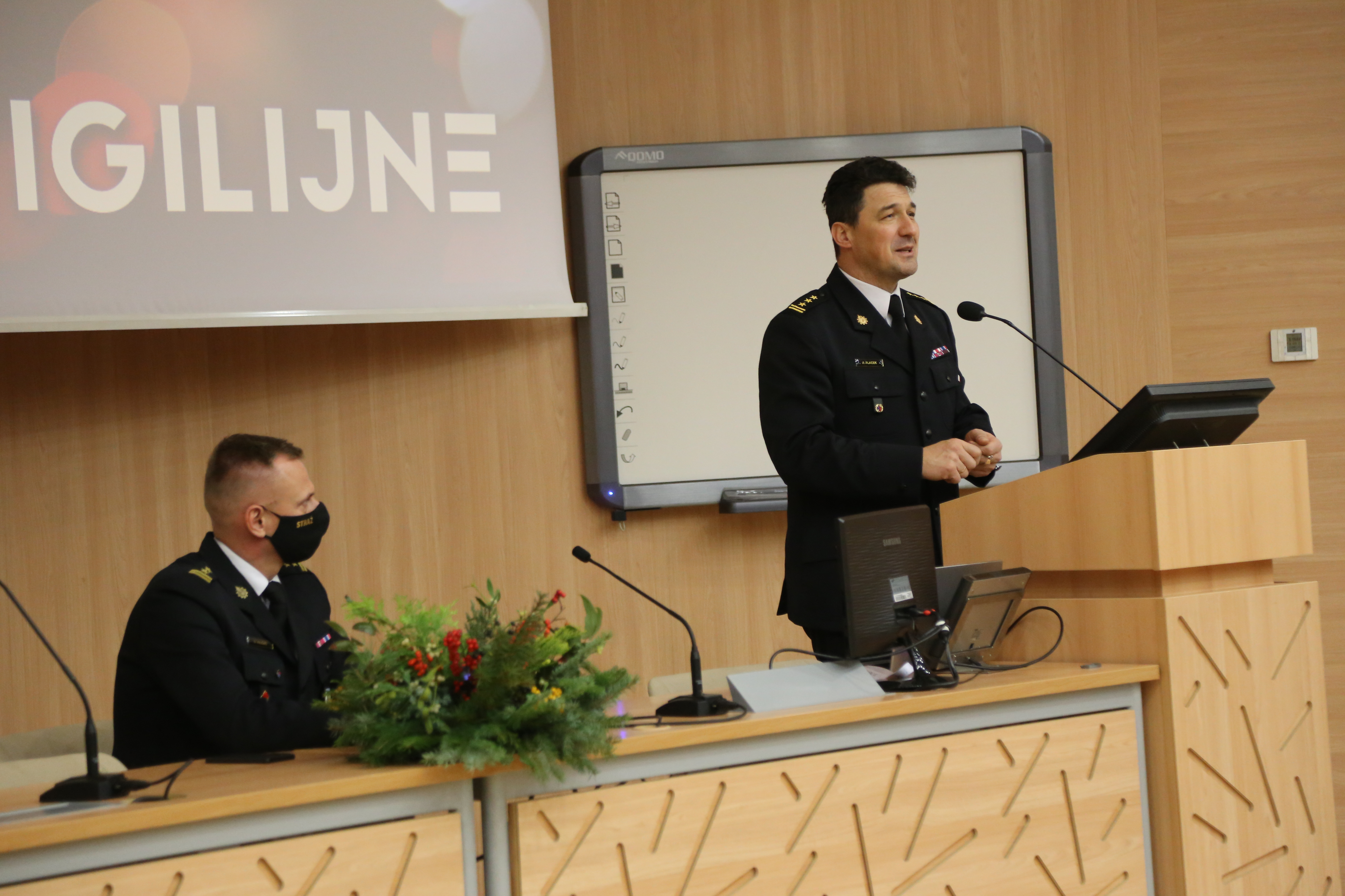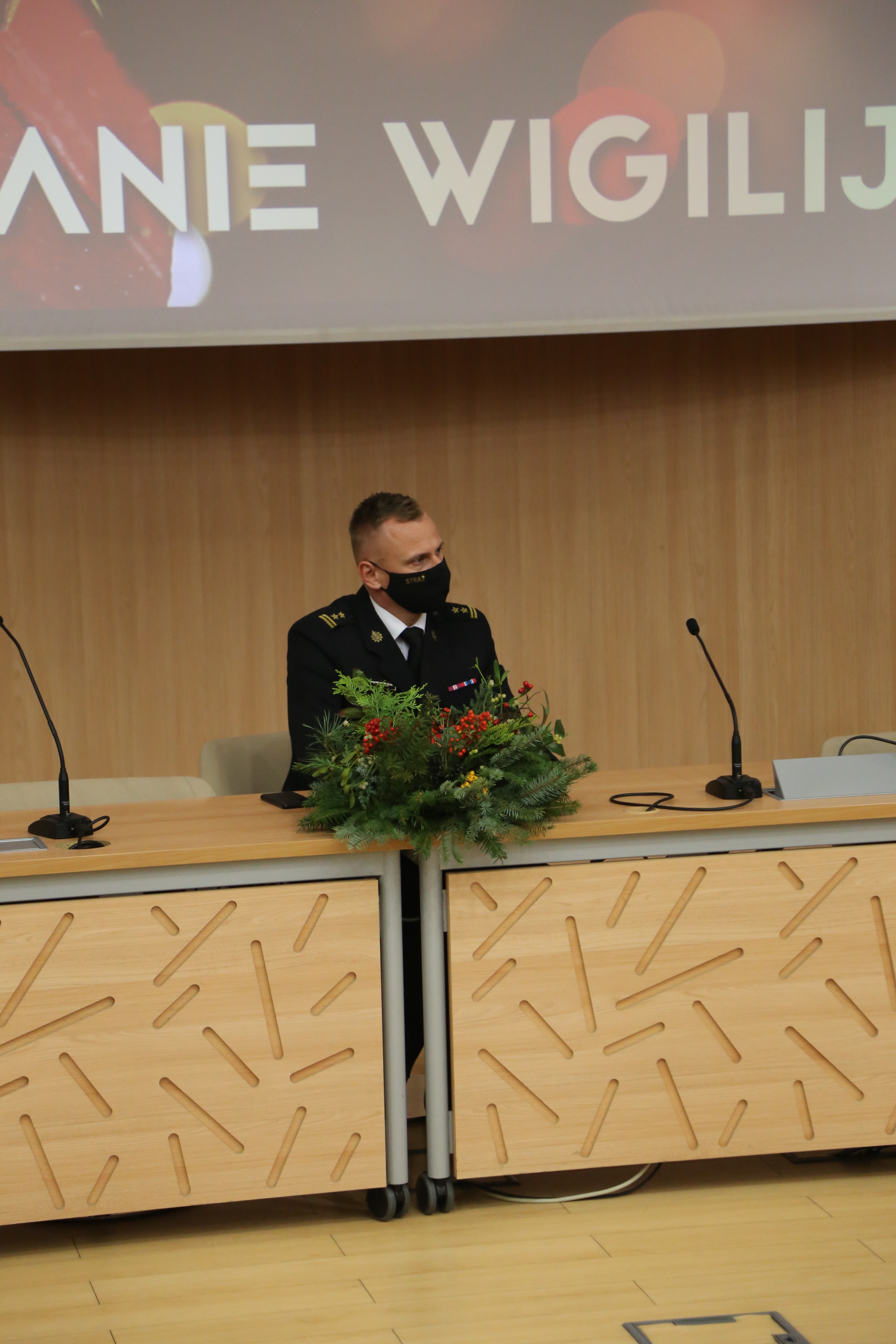 Na wstępie Komendant Centralnej Szkoły PSP w Częstochowie st. bryg. Piotr Placek powitał zebranych i życzył wszystkim spokojnych, rodzinnych Świąt Bożego Narodzenia oraz zdrowia i szczęścia w zbliżającym się 2022 roku. Żeby tradycji stało się zadość, wszyscy zebrani mogli wziąć opłatek. Z uwagi na pandemię, odstąpiono od dzielenia się opłatkiem i składania sobie bezpośrednio życzeń. Dla wspólnego bezpieczeństwa wszyscy zebrani pozdrowili się wzajemnie z oddali.