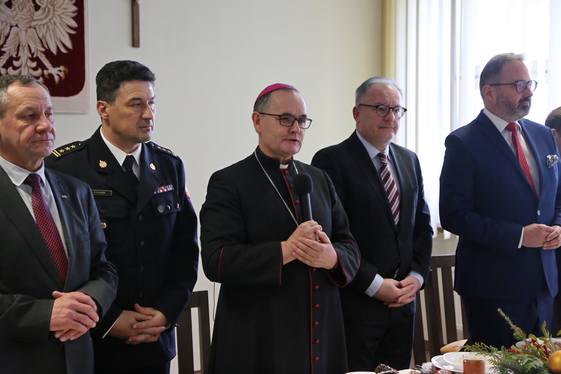 Abp Andrzej Przybylski – Biskup pomocniczy Archidiecezji Częstochowskiej w swoim przemówieniu życzył wszystkim zebranym spokojnych, rodzinnych Świąt Bożego Narodzenia, pomyślności w nadchodzącym 2023 roku, strażakom jak najmniej interwencji oraz spełnienia wszystkich marzeń: "W czasie, gdy wszyscy zasiądą do wigilijnej wieczerzy, by świętować – część z Państwa będzie na służbie. I właśnie dlatego, by obywatele mogli w spokoju spotykać się z bliskimi w te Święta, ktoś musi czuwać i dbać o bezpieczeństwo innych. Za tą służbę dziś Wam dziękuję! Mimo że każdego dnia zmagacie się Państwo ze skutkami wypadków, pożarów, z tym, co niebezpieczne i groźne, to mam nadzieję, że świąteczne dni na służbie będą pełne spokoju i sprawią, że ilość koniecznych interwencji będzie jak najmniejsza".